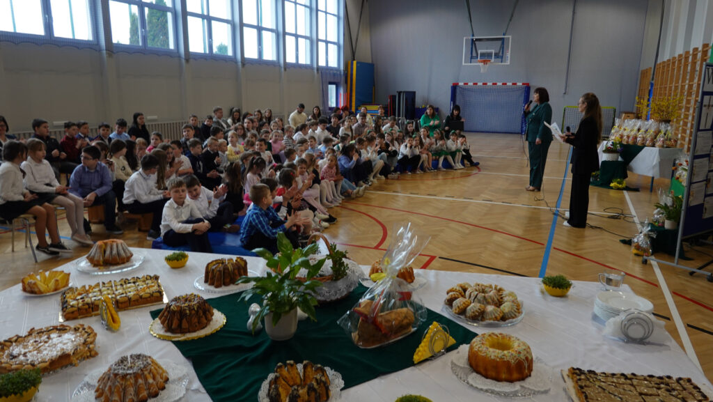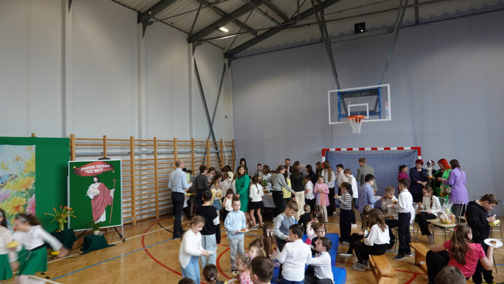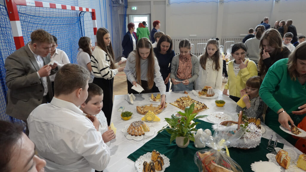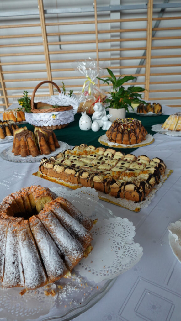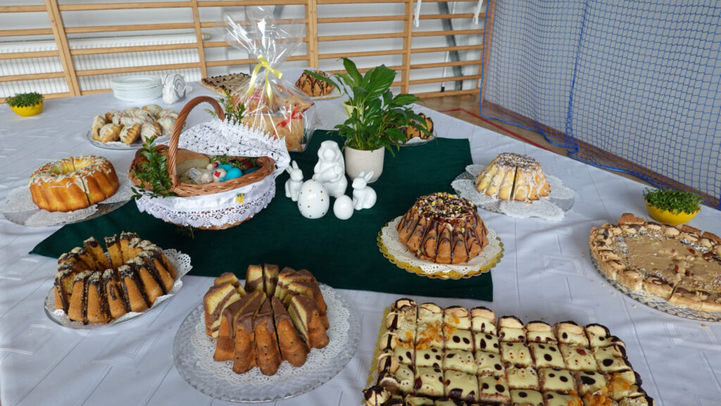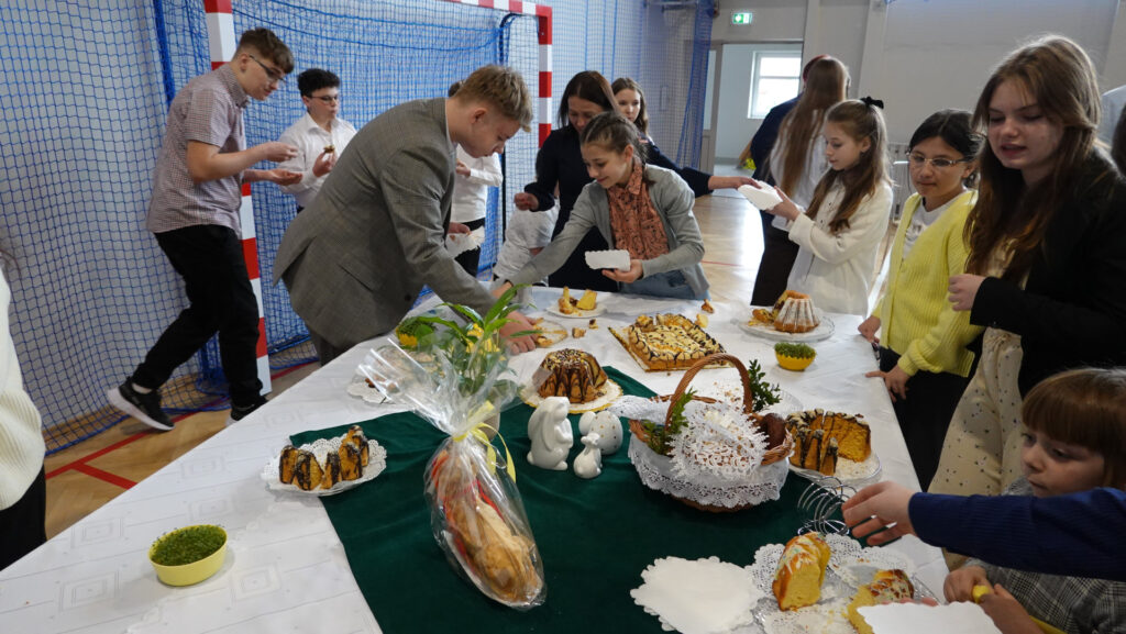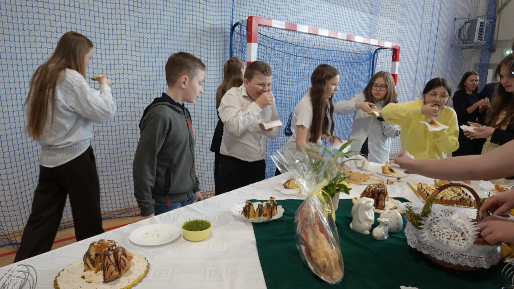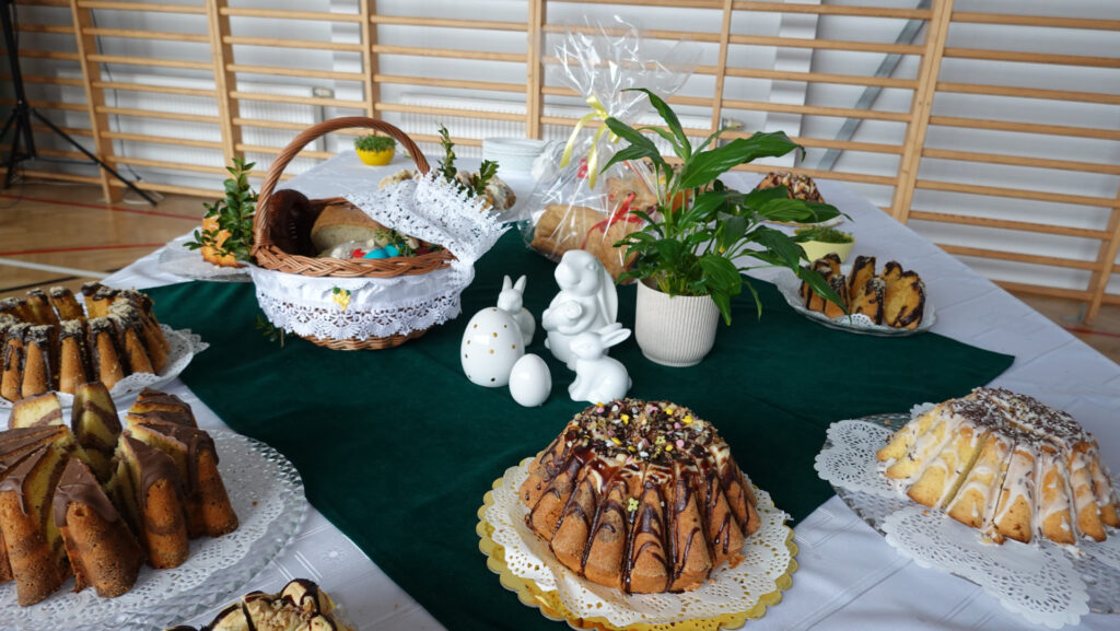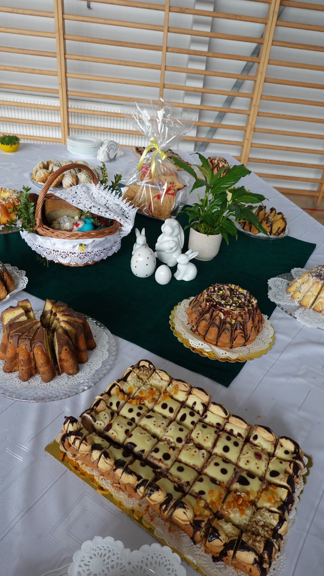 Po części artystycznej przyszedł czas na wspólny poczęstunek. Stół wielkanocny uginał się od tradycyjnych wypieków – aromatycznych babek oraz pięknie zdobionych mazurków, które cieszyły nie tylko podniebienie, lecz także oko. Była to doskonała okazja do integracji oraz rozmów w miłej, świątecznej atmosferze. Wszystkie ciasta zostały upieczone przez Rodziców, za co składamy serdeczne podziękowania – za ich zaangażowanie i trud włożony w przygotowanie tych pysznych wypieków.