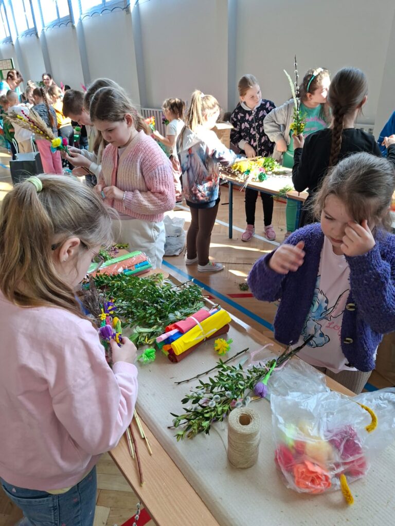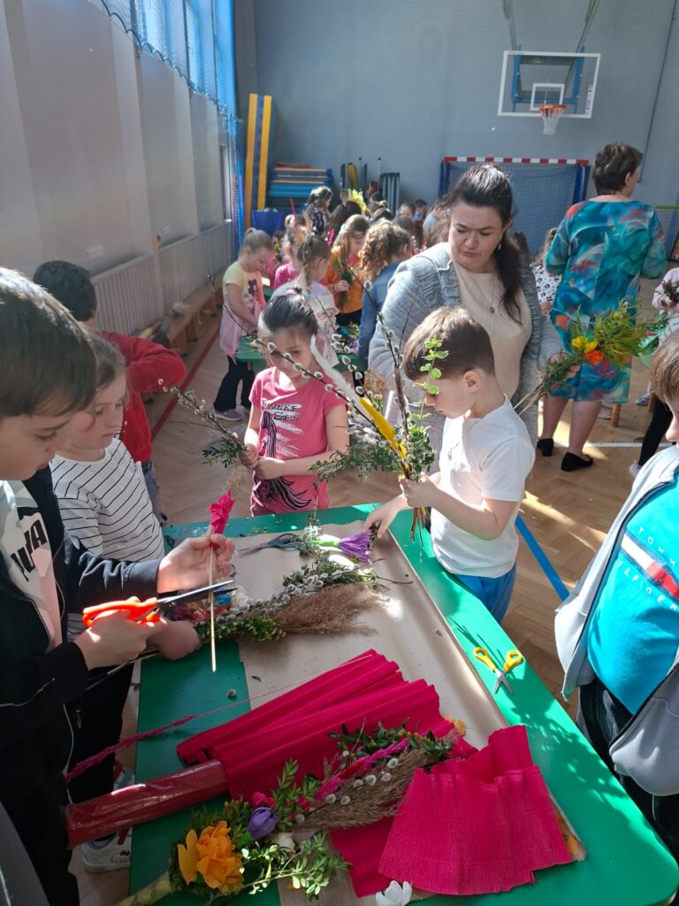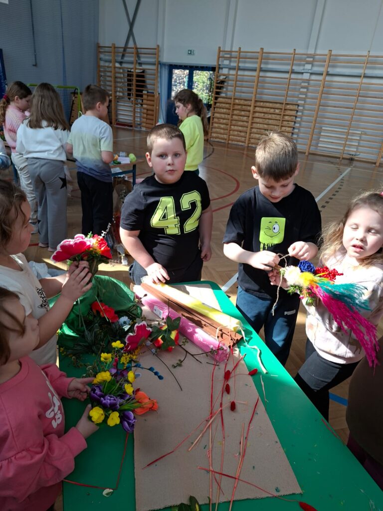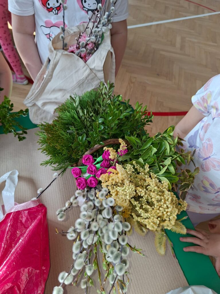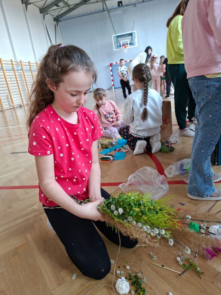 z najważniejszych elementów zdobiących palmy wielkanocne. Praca ta sprawiła uczestnikom wiele radości, a jednocześnie była doskonałą okazją do rozwijania zdolności manualnych, wyobraźni oraz poczucia estetyki.