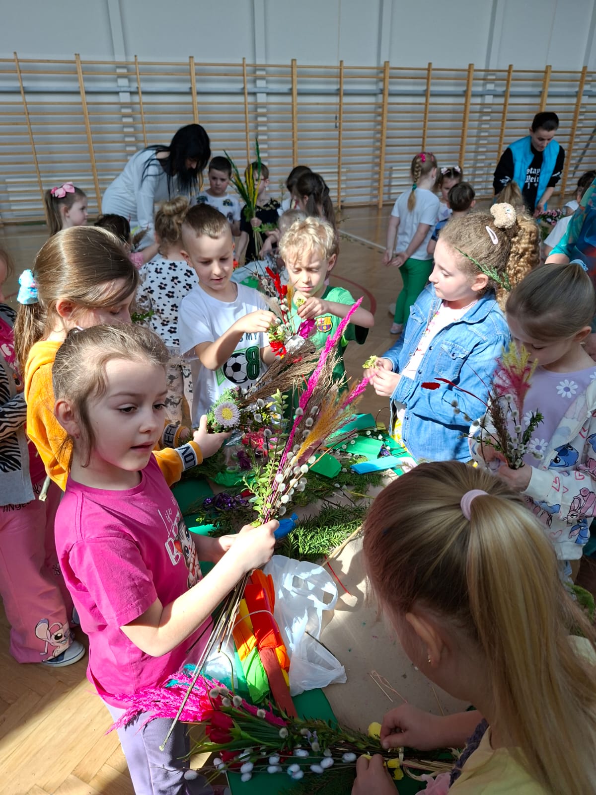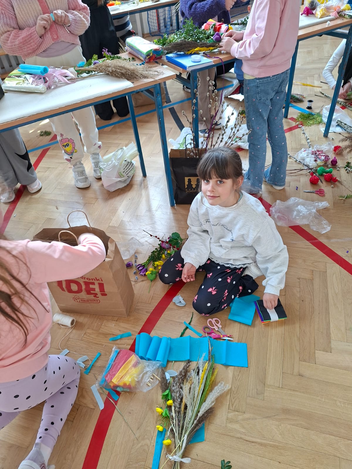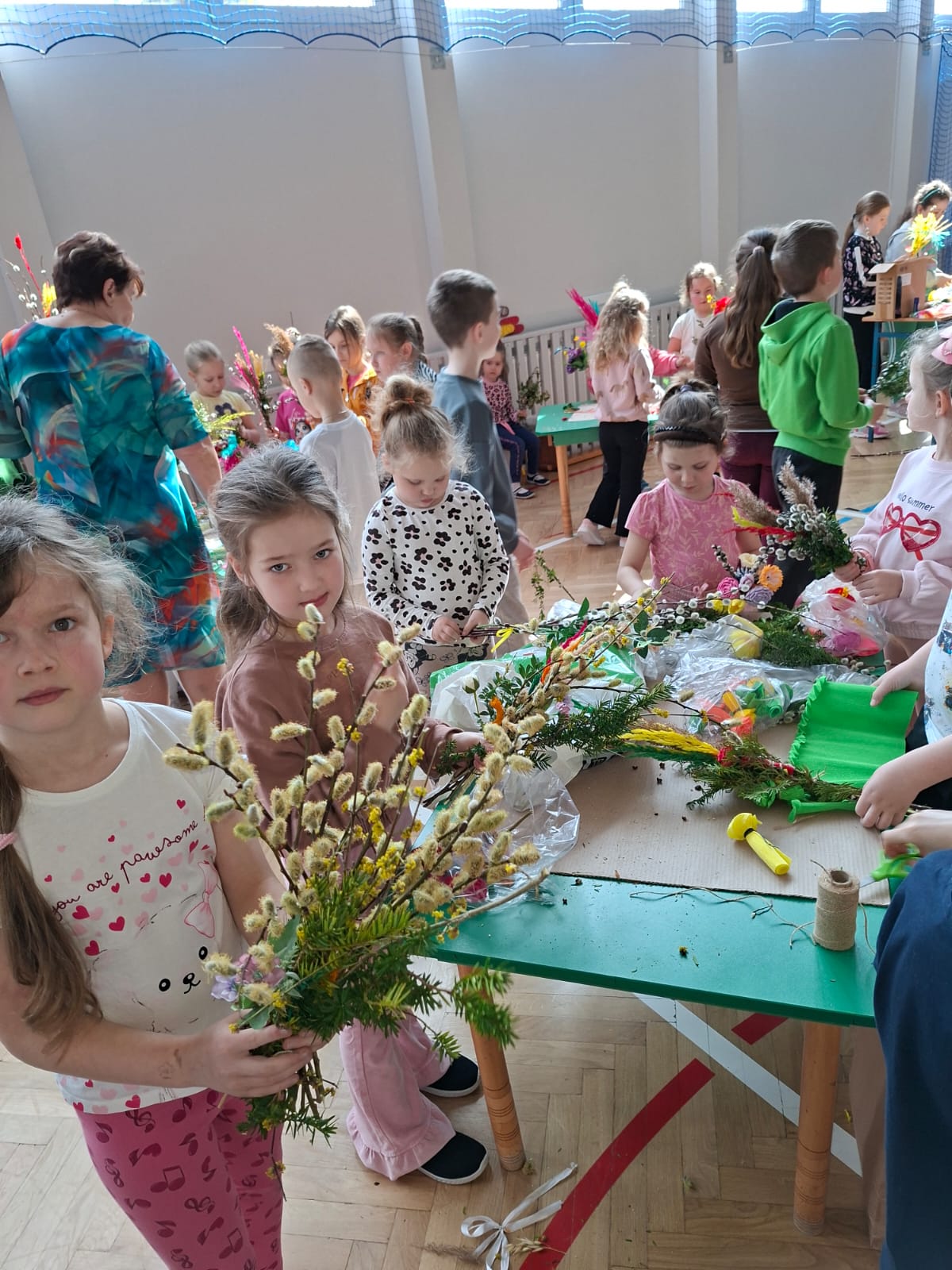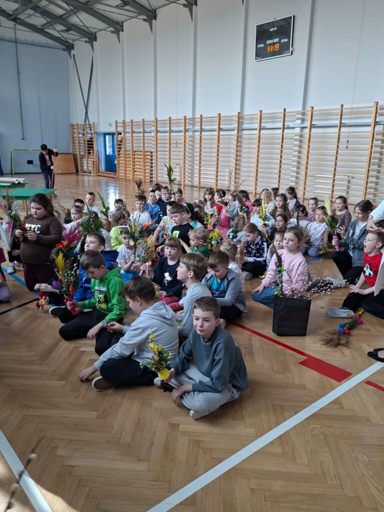 Kulminacyjnym momentem spotkania było samodzielne tworzenie palm wielkanocnych. Każde dziecko, wykorzystując przygotowane materiały, mogło zaprojektować i wykonać własną, niepowtarzalną palmę. Powstałe prace zachwycały bogactwem kolorów, różnorodnością form oraz ogromnym zaangażowaniem młodych twórców. Dzieci z dumą prezentowały swoje dzieła, a radość