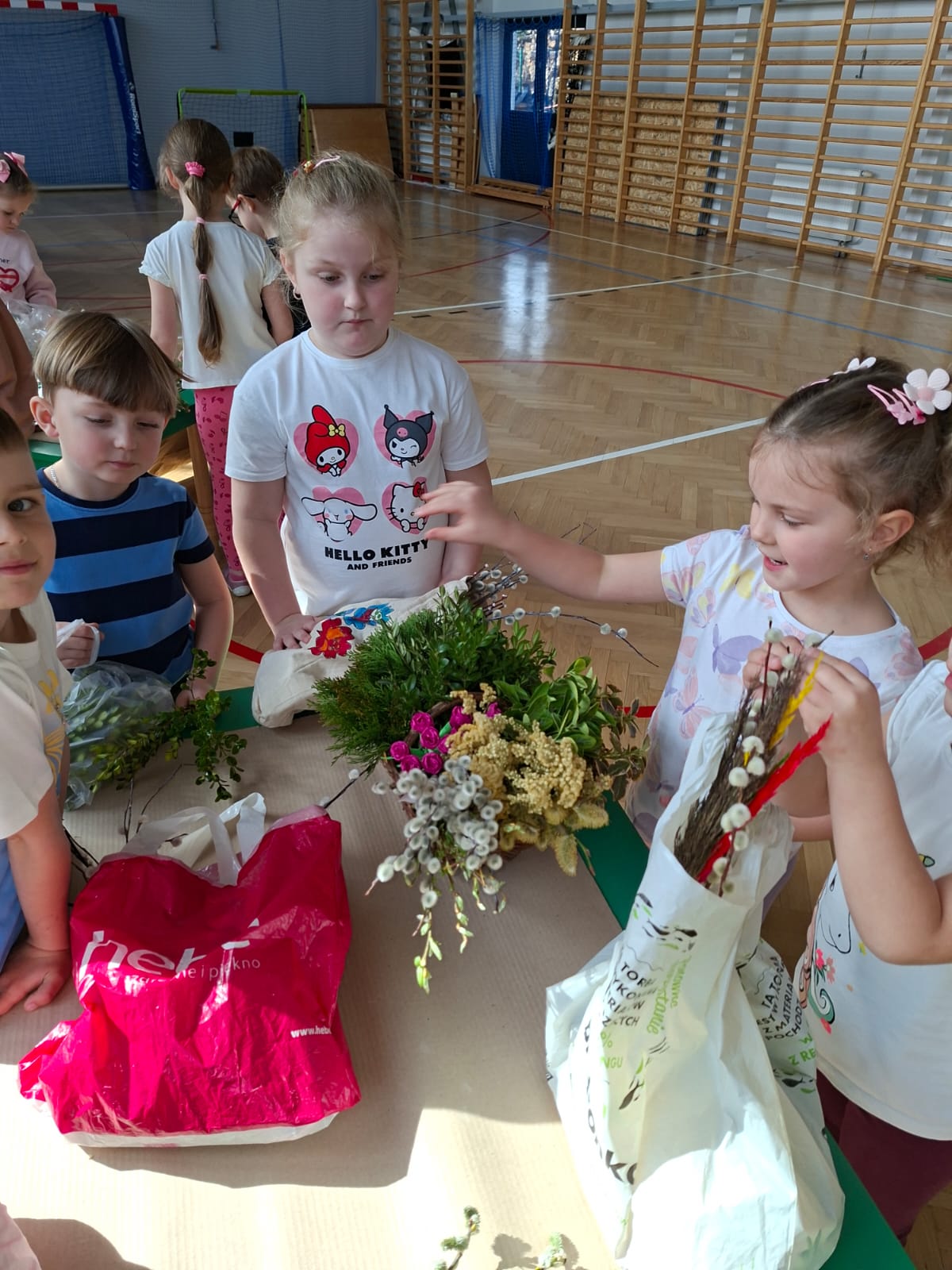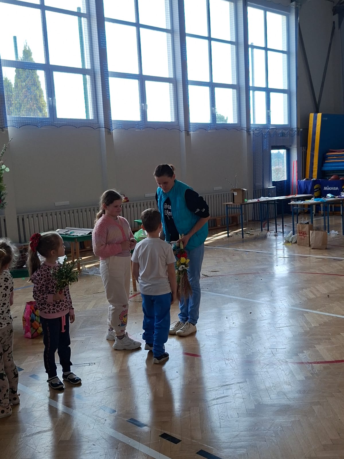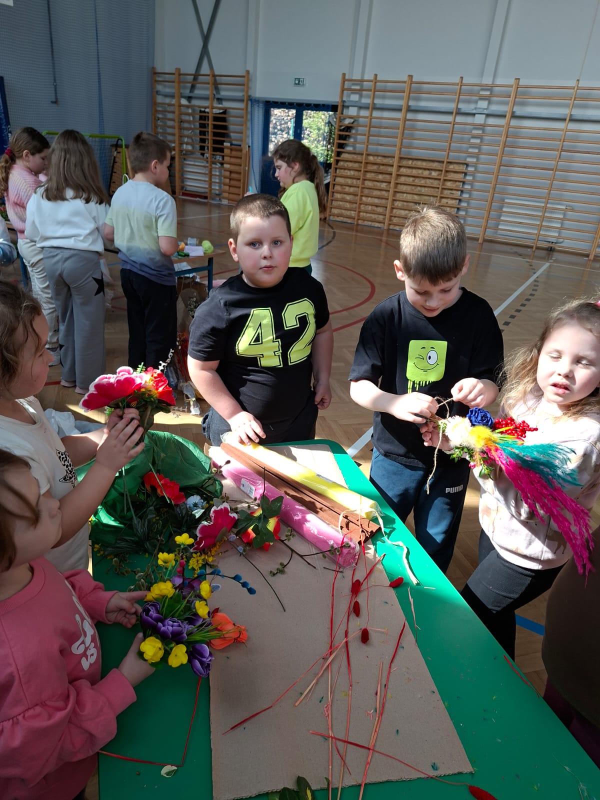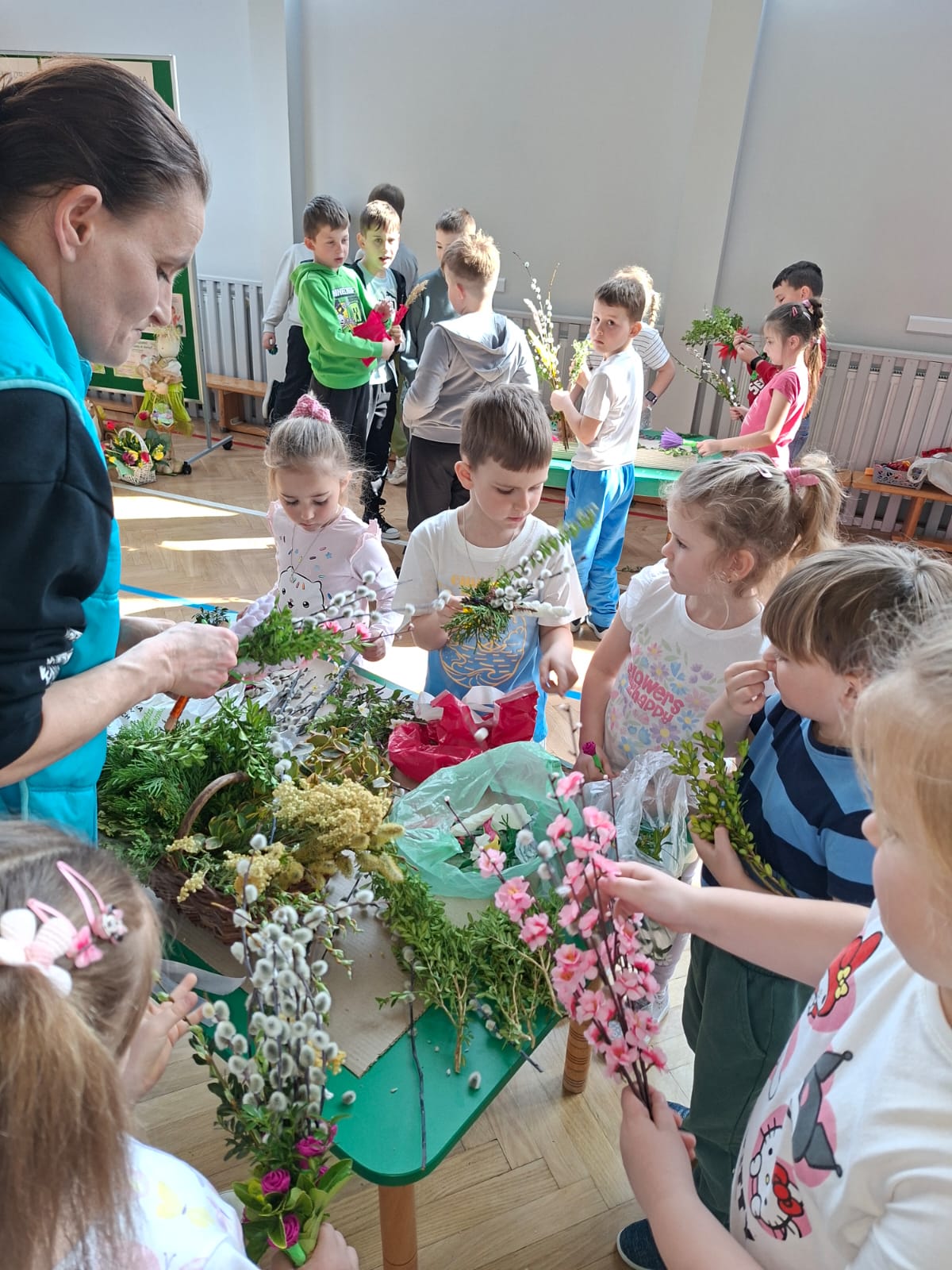Kulminacyjnym momentem spotkania było samodzielne tworzenie palm wielkanocnych. Każde dziecko, wykorzystując przygotowane materiały, mogło zaprojektować i wykonać własną, niepowtarzalną palmę. Powstałe prace zachwycały bogactwem kolorów, różnorodnością form oraz ogromnym zaangażowaniem młodych twórców. Dzieci z dumą prezentowały swoje dzieła, a radość