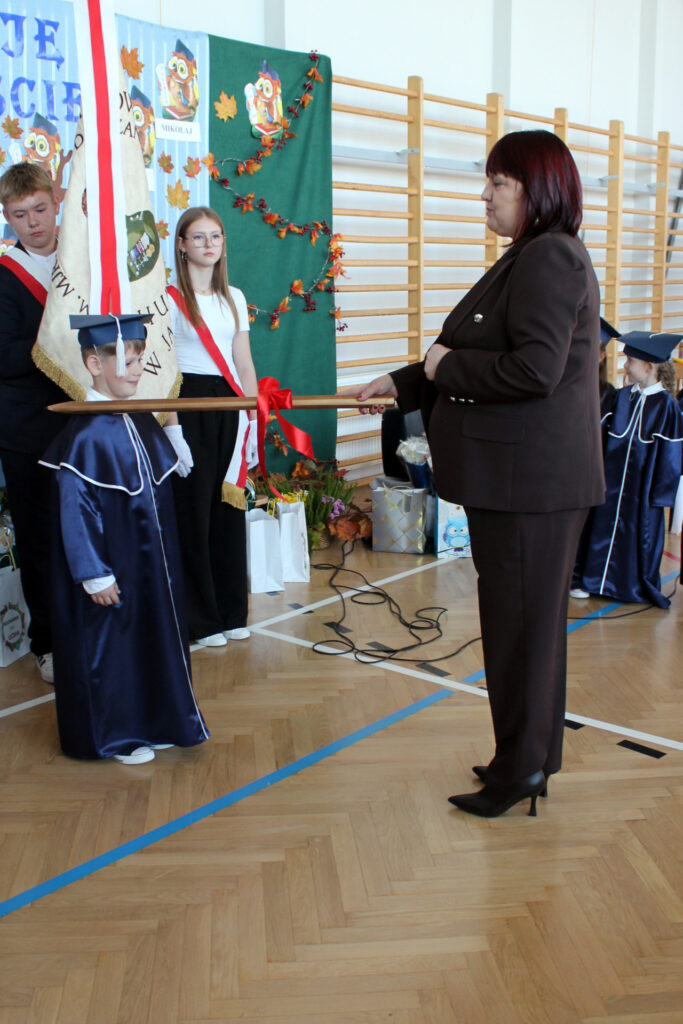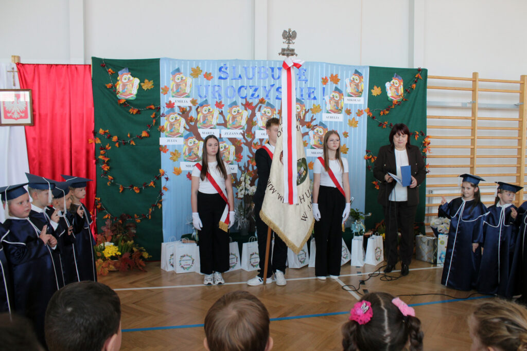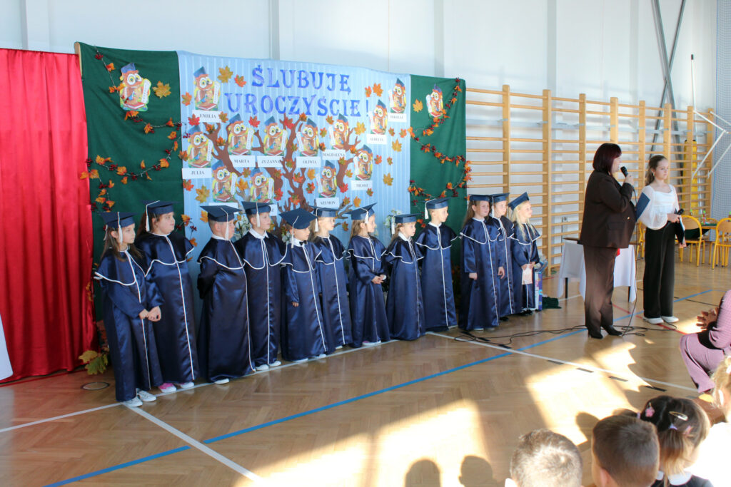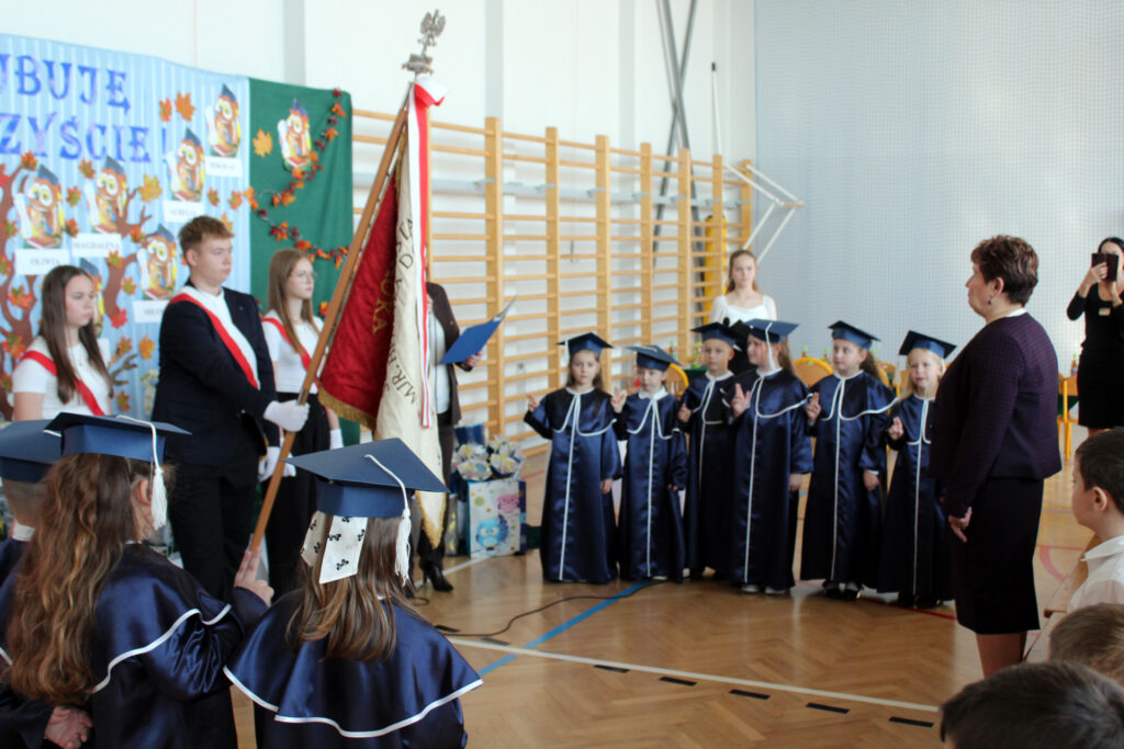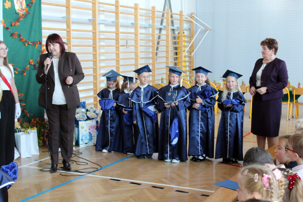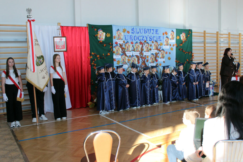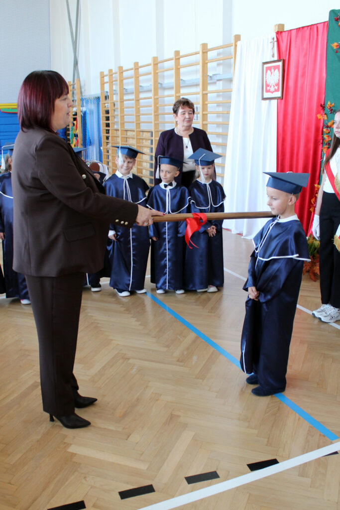 W czasie uroczystości pierwszoklasiści w obecności sztandaru szkoły złożyli uroczyste ślubowanie a Dyrektor szkoły dokonała aktu pasowania na ucznia symbolicznym ołówkiem.