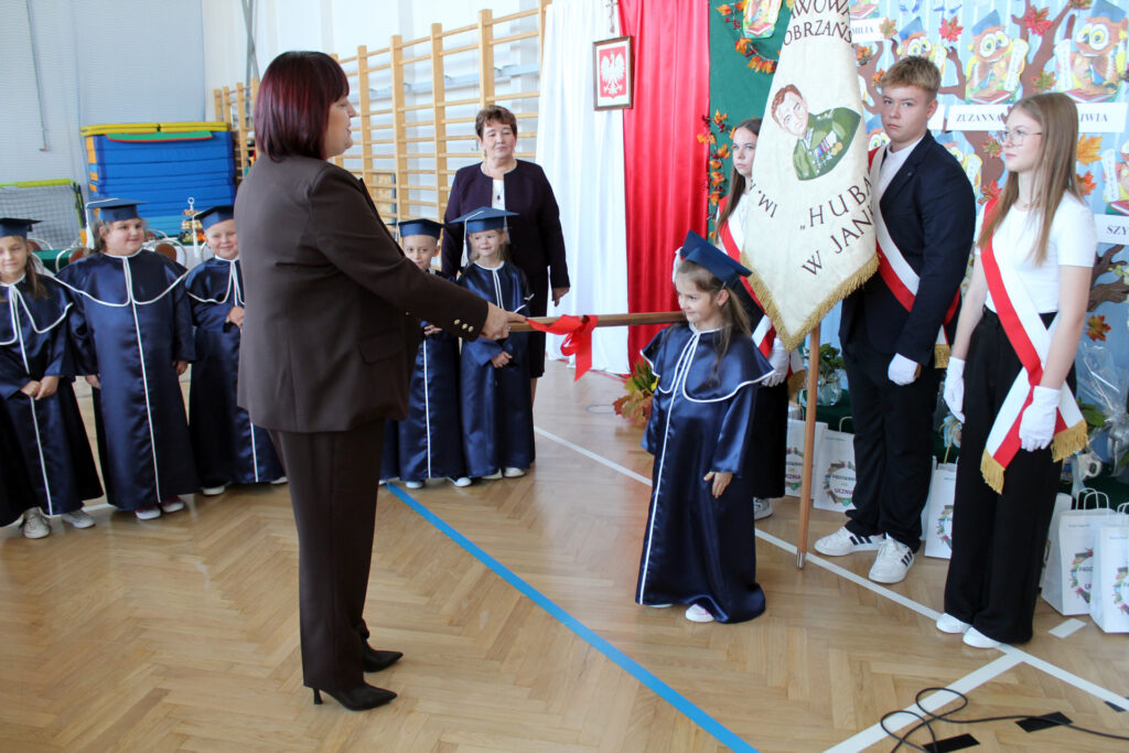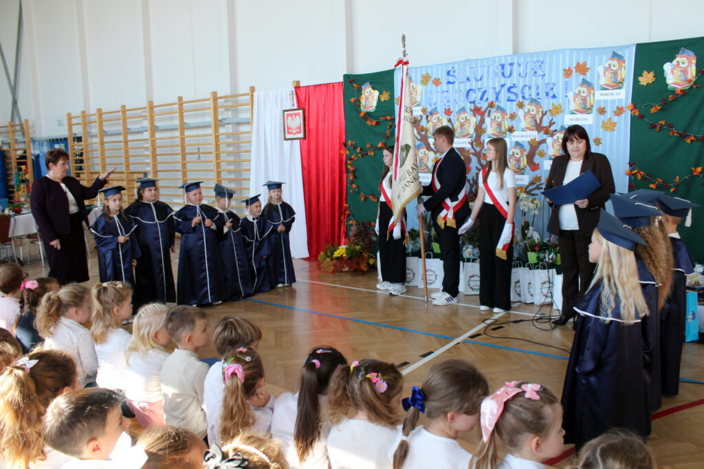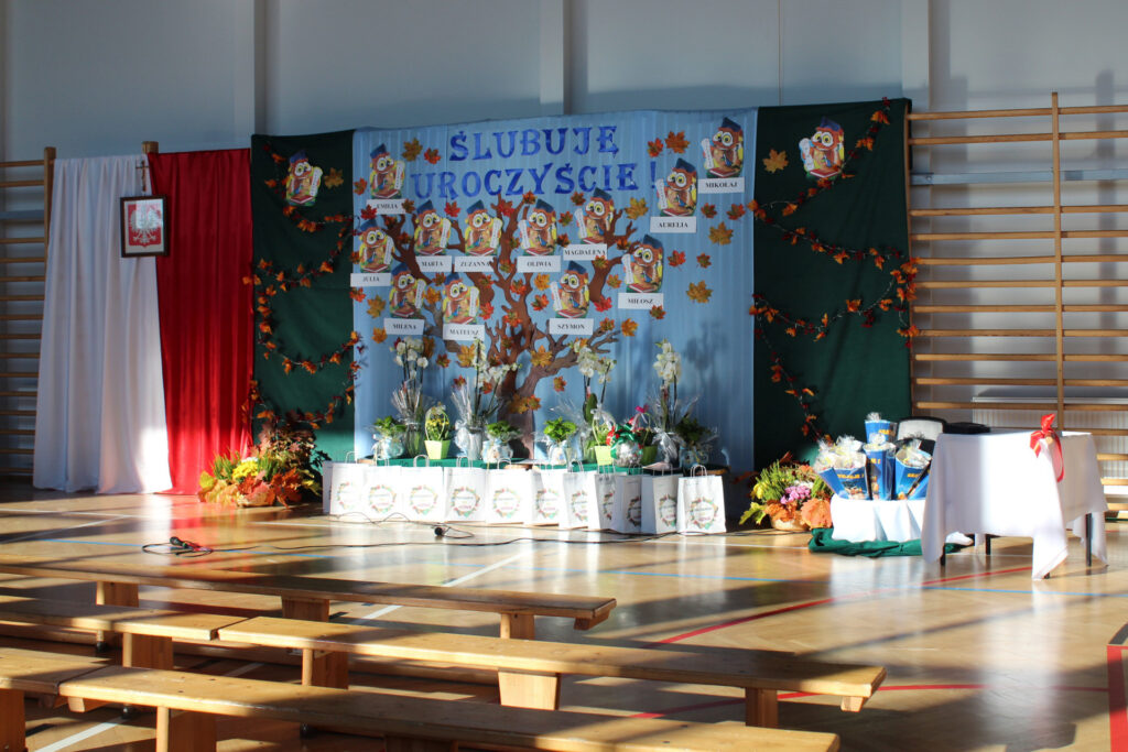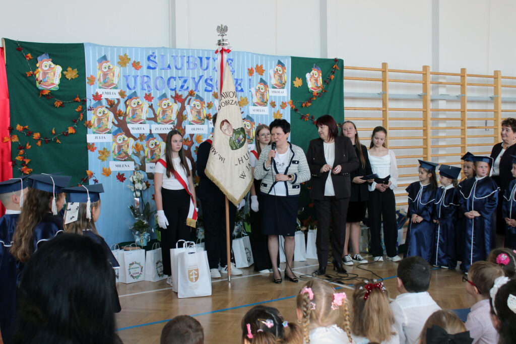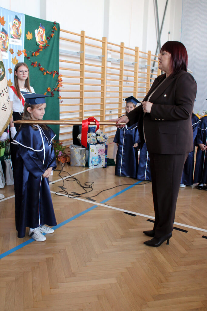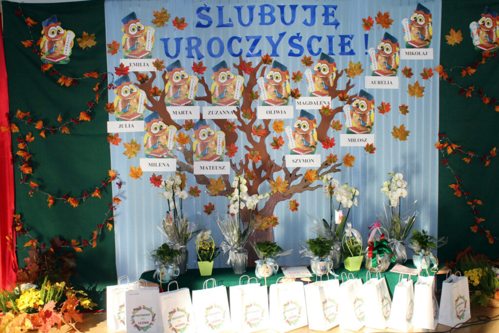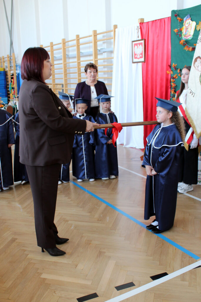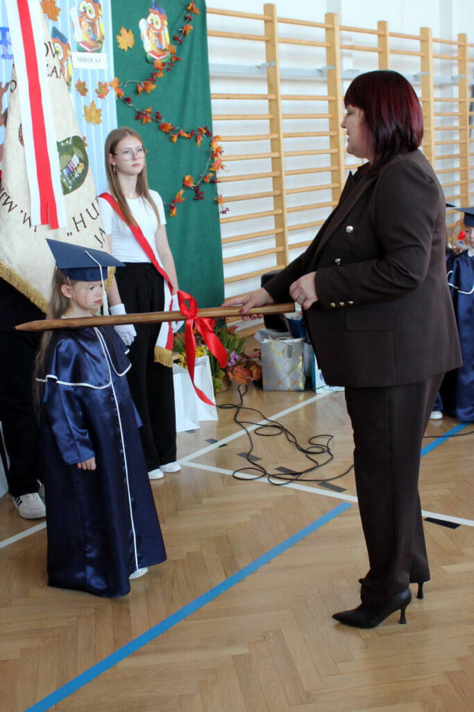 W czasie uroczystości pierwszoklasiści w obecności sztandaru szkoły złożyli uroczyste ślubowanie a Dyrektor szkoły dokonała aktu pasowania na ucznia symbolicznym ołówkiem.