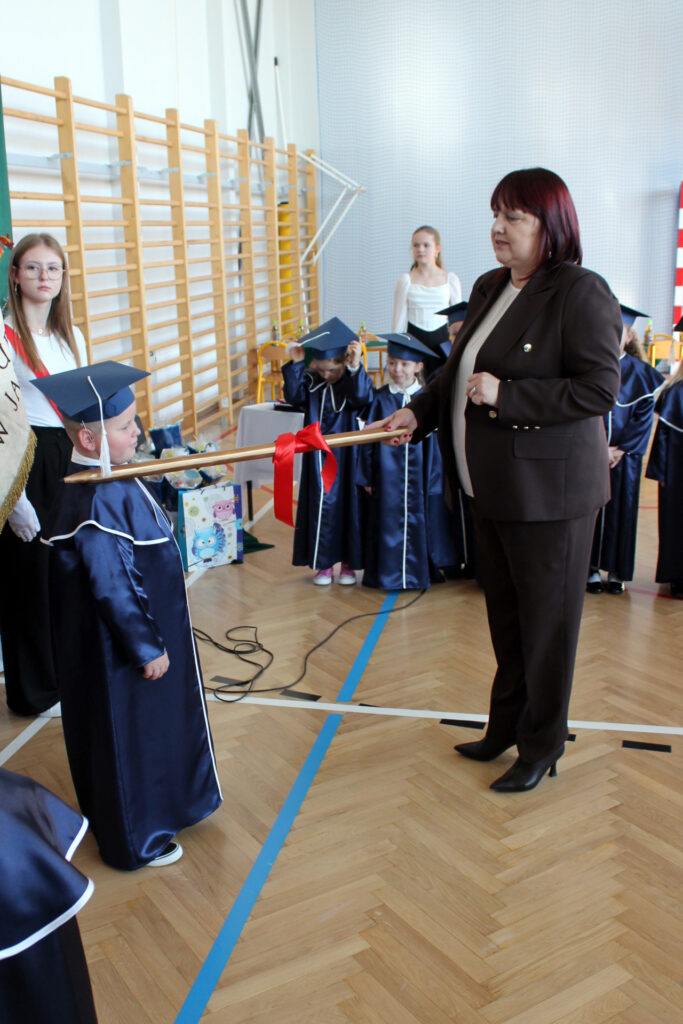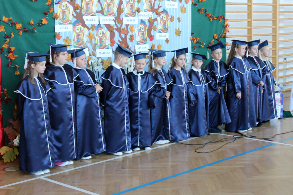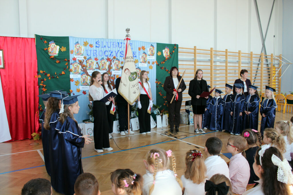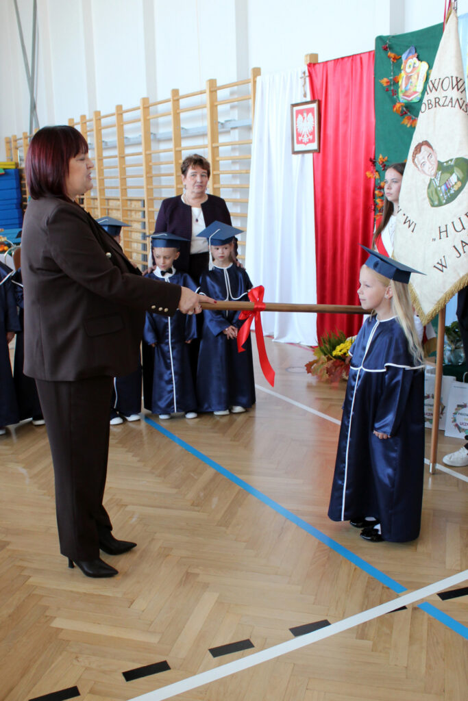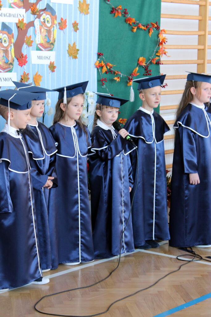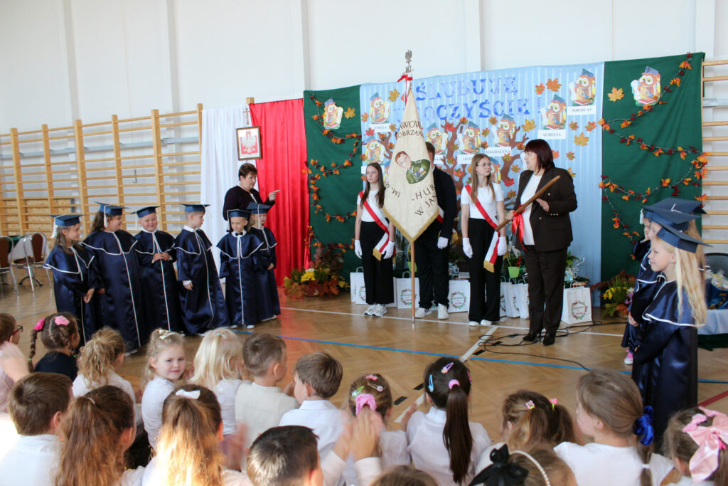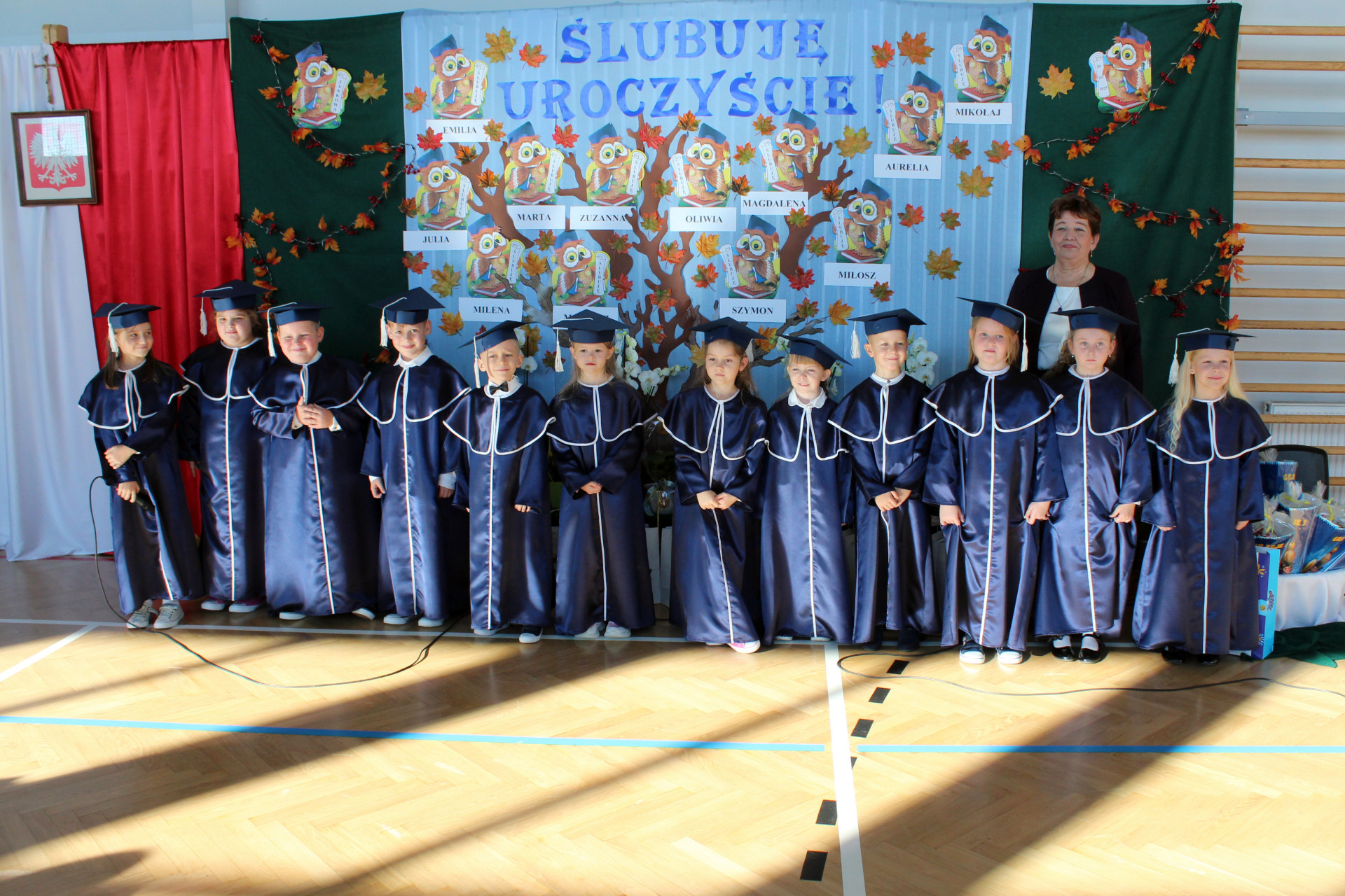 W czasie uroczystości pierwszoklasiści w obecności sztandaru szkoły złożyli uroczyste ślubowanie a Dyrektor szkoły dokonała aktu pasowania na ucznia symbolicznym ołówkiem.