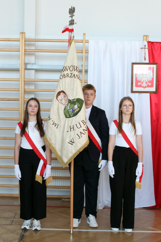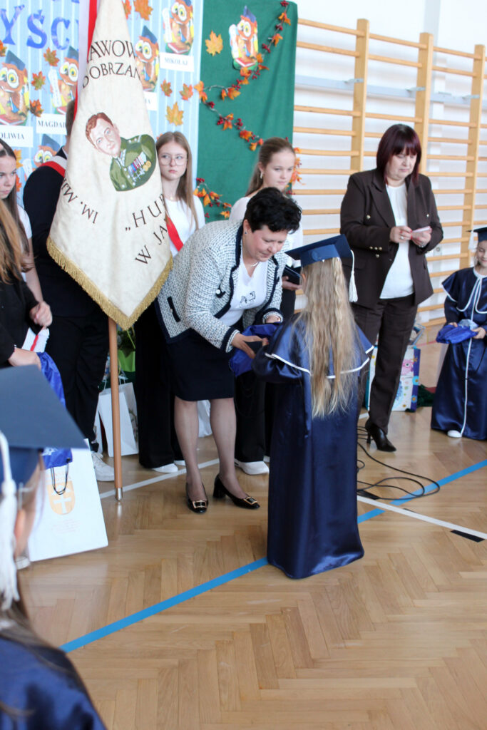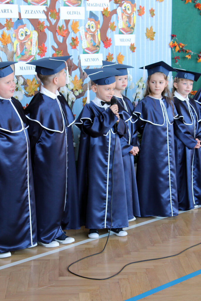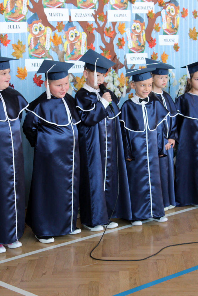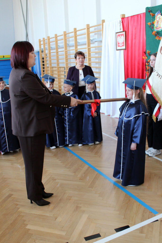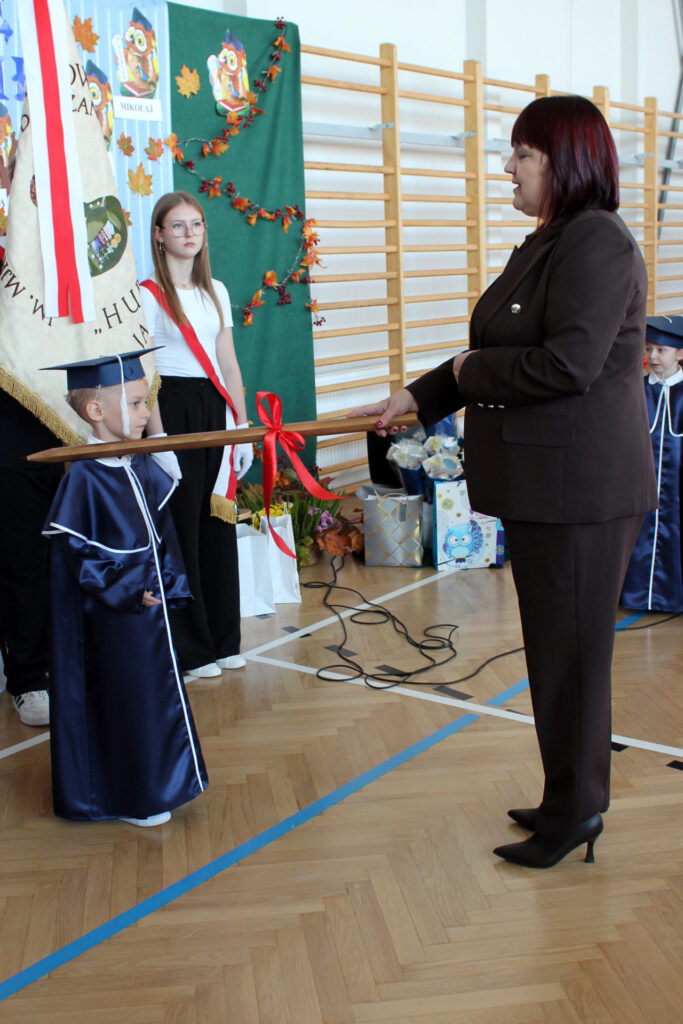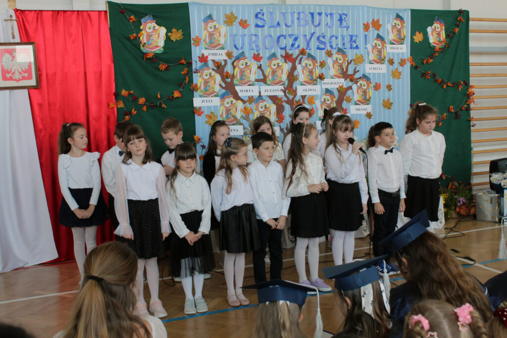 W czasie uroczystości pierwszoklasiści w obecności sztandaru szkoły złożyli uroczyste ślubowanie a Dyrektor szkoły dokonała aktu pasowania na ucznia symbolicznym ołówkiem.