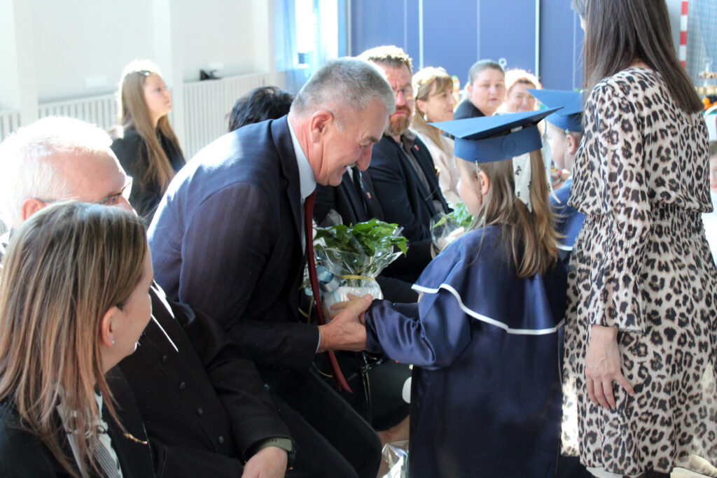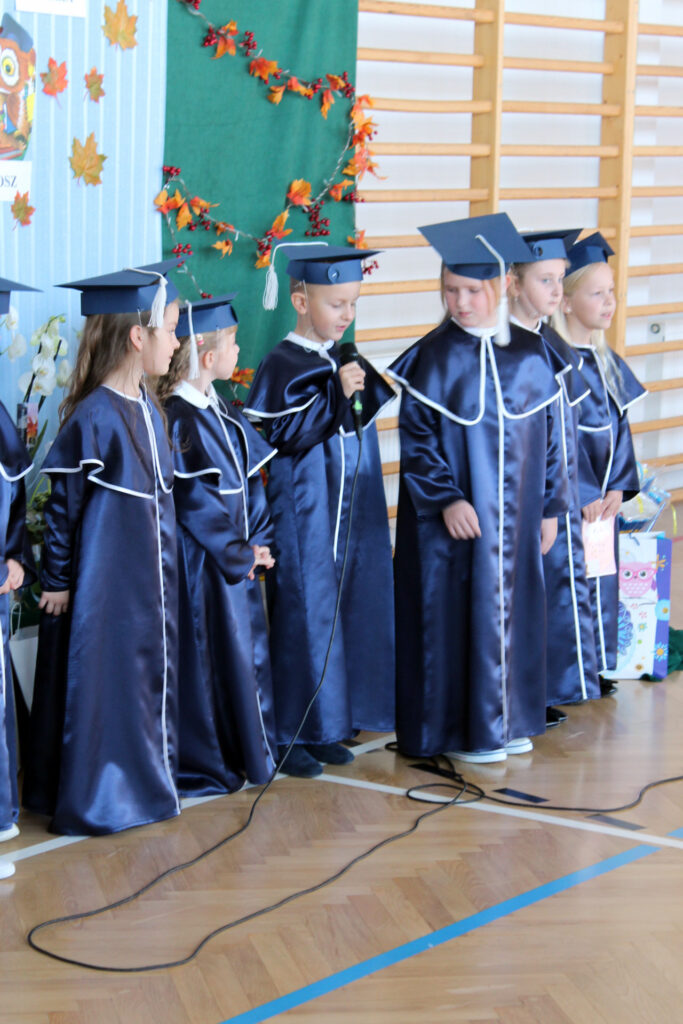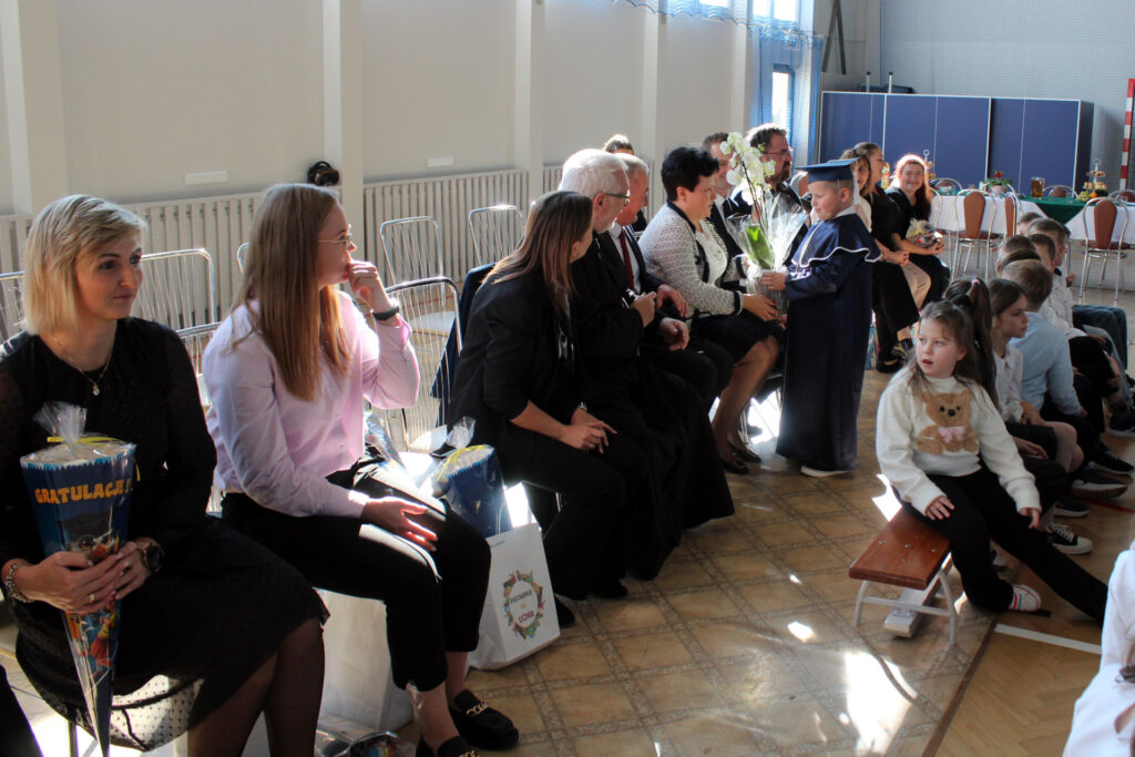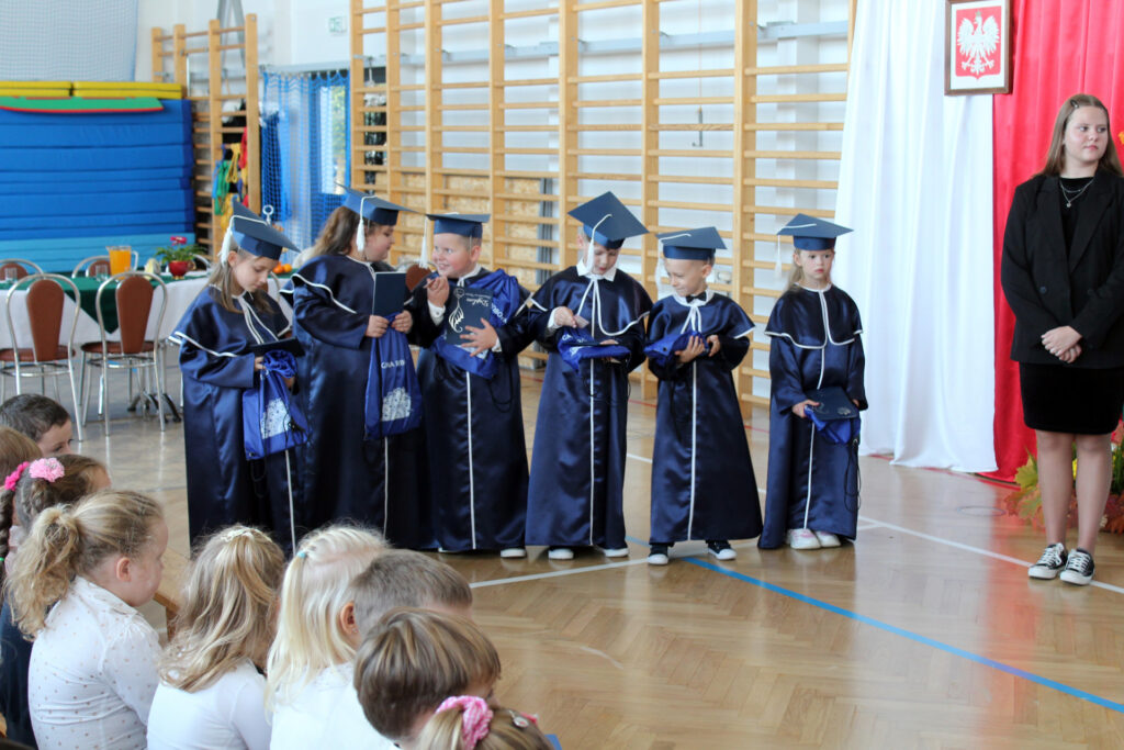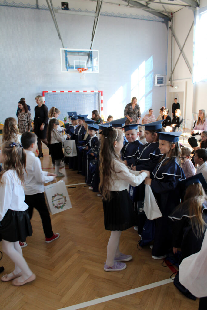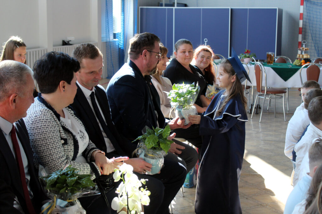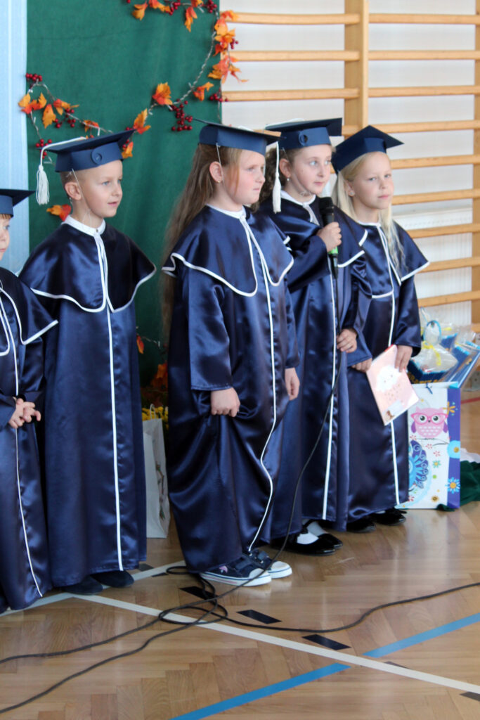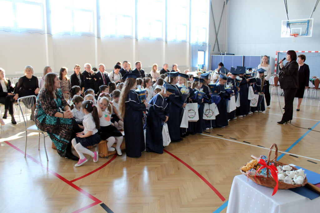 Uczniowie otrzymali pamiątkowe dyplomy z rąk Pani Sekretarz oraz upominki od Burmistrza Bobowej. Pani dyrektor złożyła gratulacje i życzenia dla uczniów. Następnie klasa druga pod kierunkiem pani Agnieszki Pater powitała pierwszoklasistów wierszem i piosenką oraz wręczyli upominki. Prezentów było więcej, gdyż przybyli goście też obdarowali pierwszaków słodkościami. Rogi obfitości dzieci zostały od swoich rodziców. Życzenia pierwszakom złożyli też przewodnicząca szkoły Joanna Chorąży