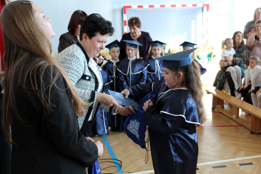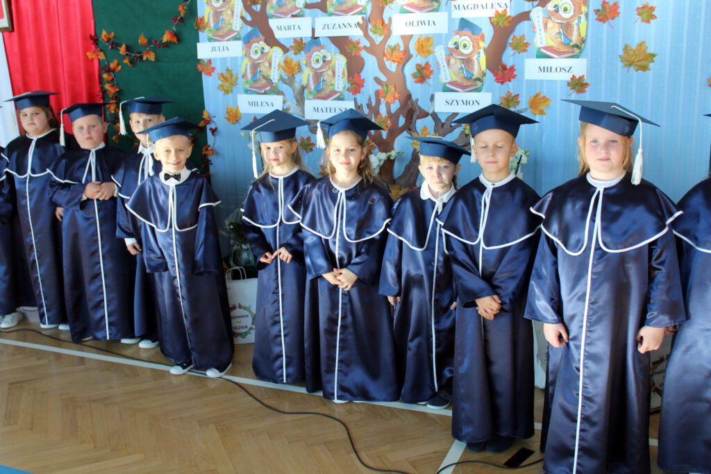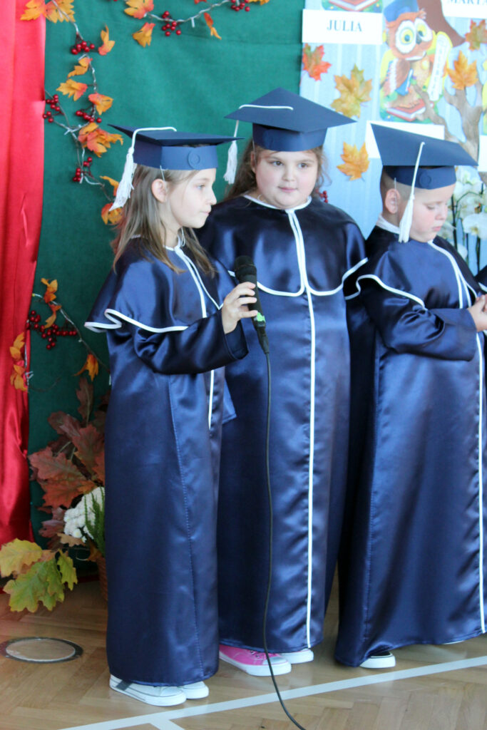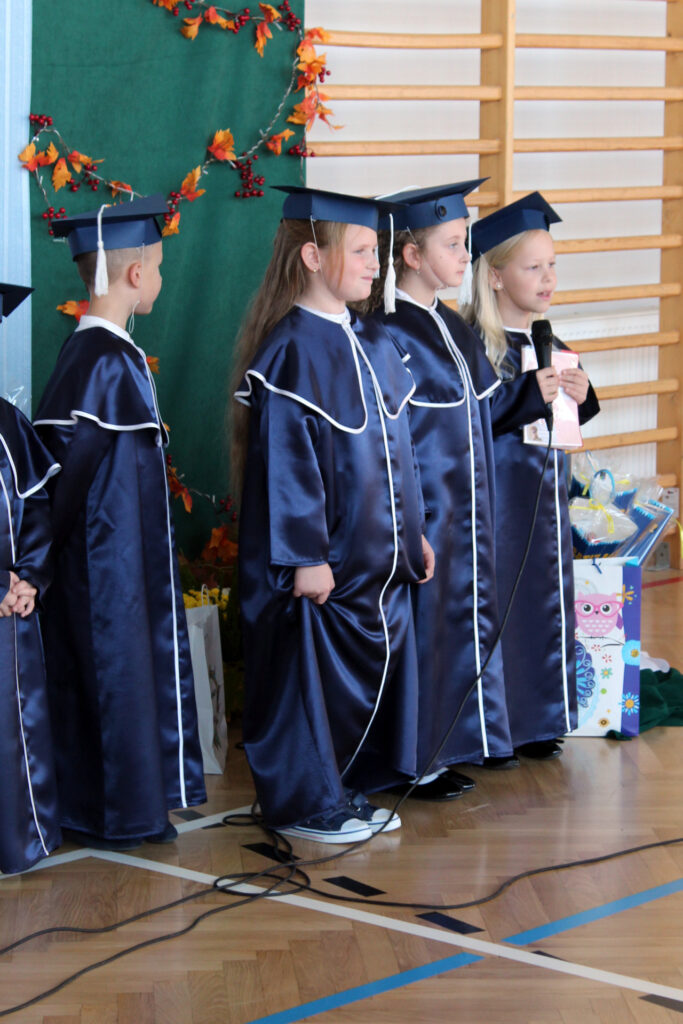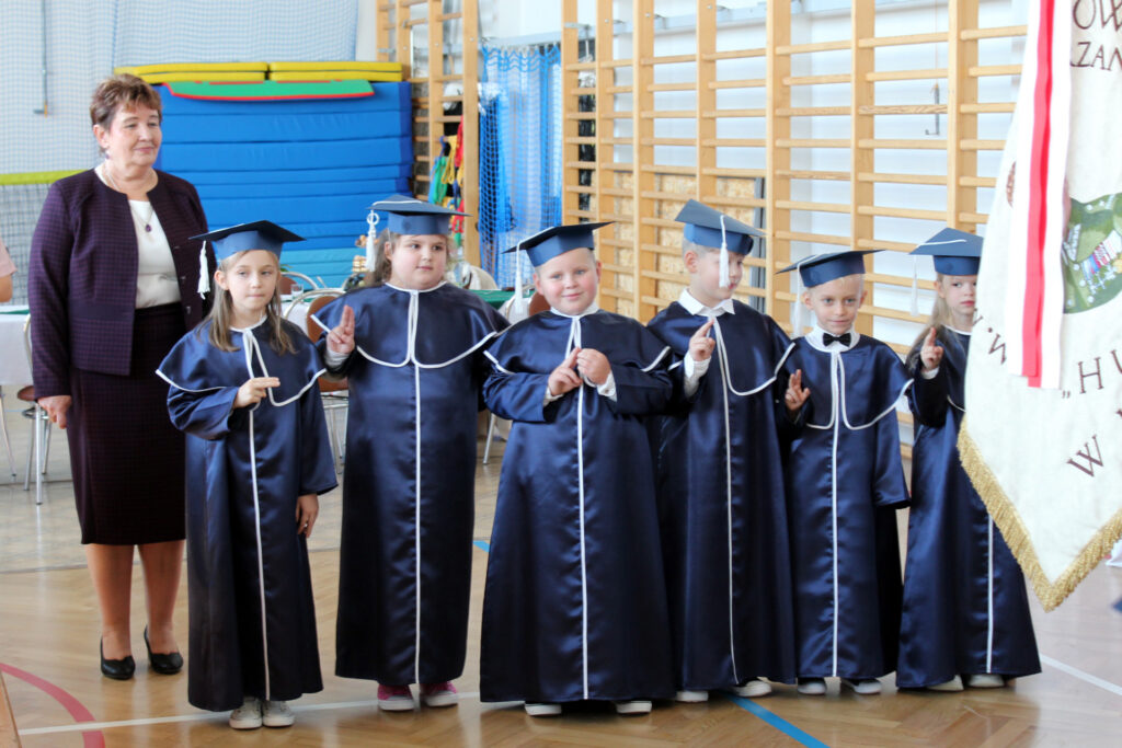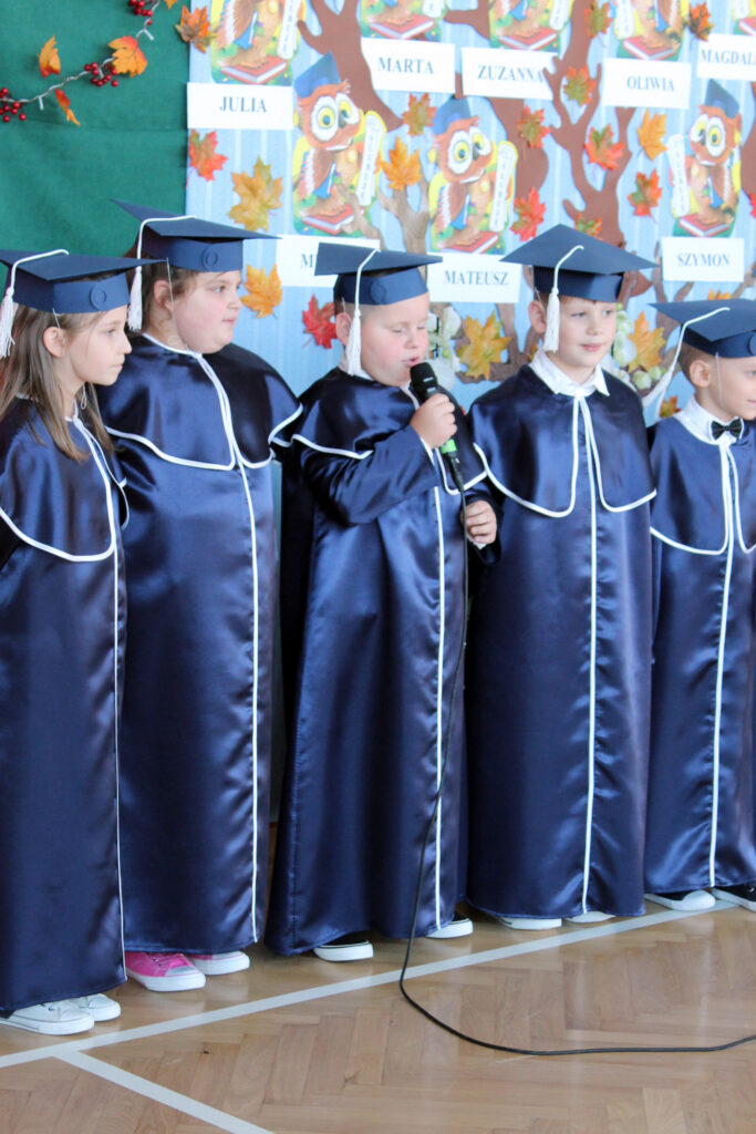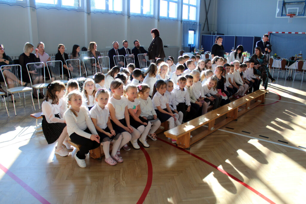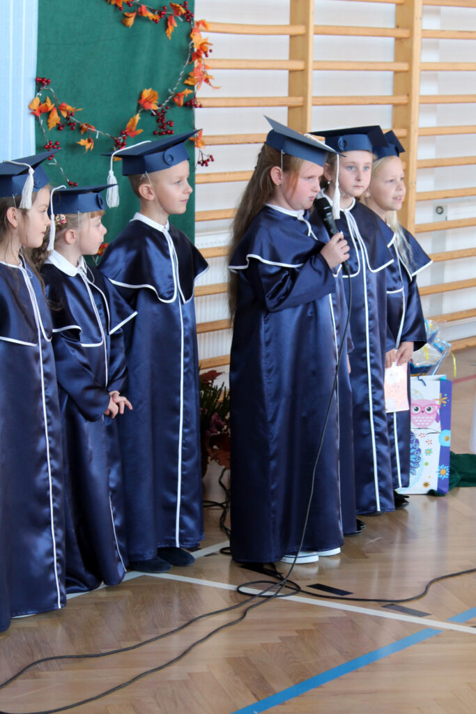 Uczniowie otrzymali pamiątkowe dyplomy z rąk Pani Sekretarz oraz upominki od Burmistrza Bobowej. Pani dyrektor złożyła gratulacje i życzenia dla uczniów. Następnie klasa druga pod kierunkiem pani Agnieszki Pater powitała pierwszoklasistów wierszem i piosenką oraz wręczyli upominki. Prezentów było więcej, gdyż przybyli goście też obdarowali pierwszaków słodkościami. Rogi obfitości dzieci zostały od swoich rodziców. Życzenia pierwszakom złożyli też przewodnicząca szkoły Joanna Chorąży