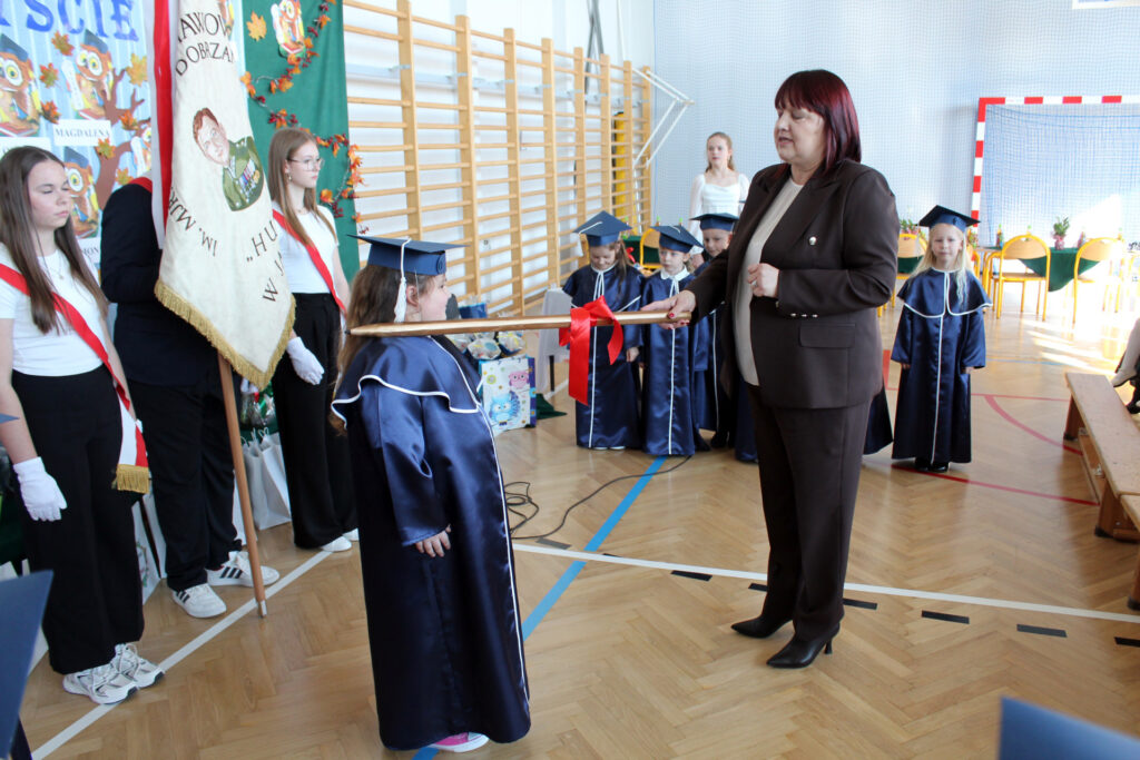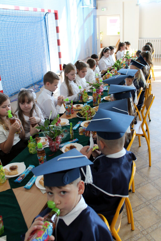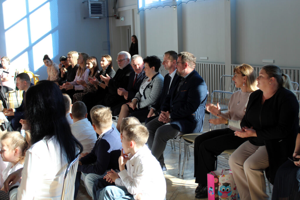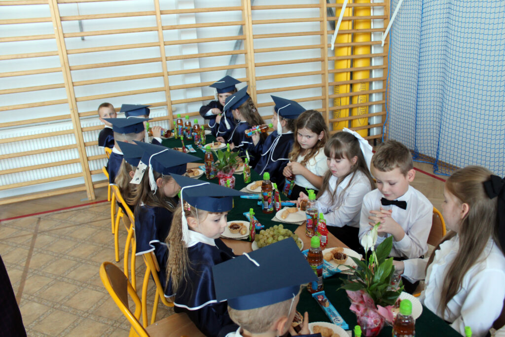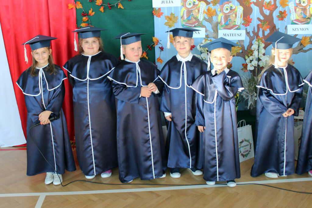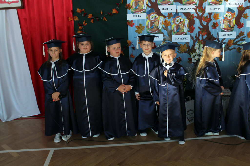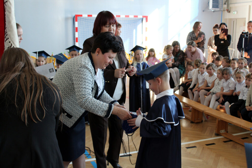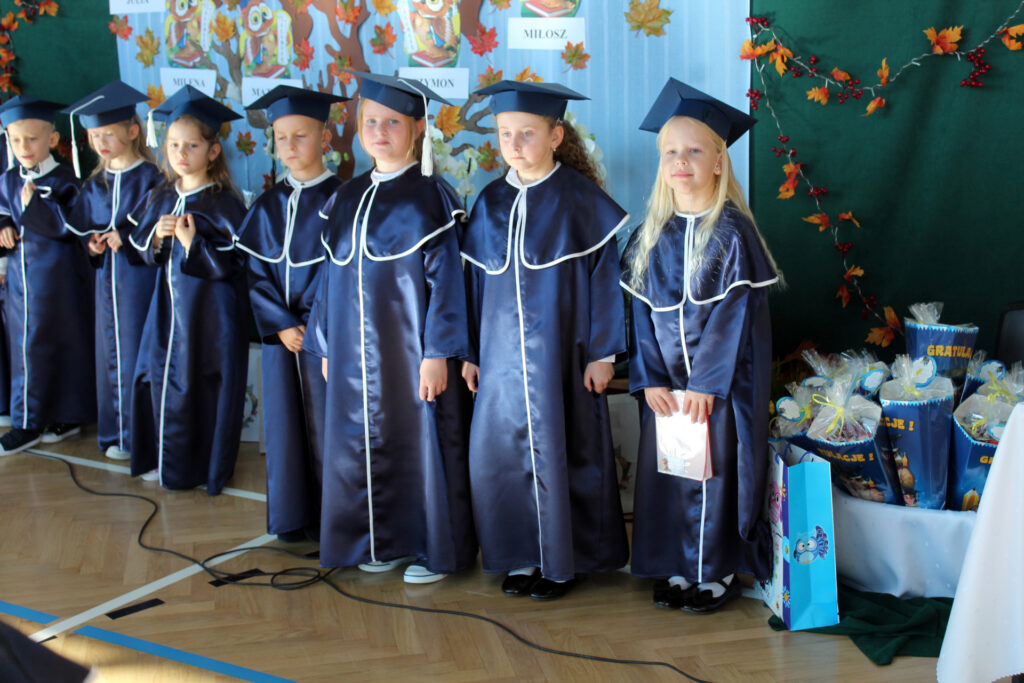 Uczniowie otrzymali pamiątkowe dyplomy z rąk Pani Sekretarz oraz upominki od Burmistrza Bobowej. Pani dyrektor złożyła gratulacje i życzenia dla uczniów. Następnie klasa druga pod kierunkiem pani Agnieszki Pater powitała pierwszoklasistów wierszem i piosenką oraz wręczyli upominki. Prezentów było więcej, gdyż przybyli goście też obdarowali pierwszaków słodkościami. Rogi obfitości dzieci zostały od swoich rodziców. Życzenia pierwszakom złożyli też przewodnicząca szkoły Joanna Chorąży