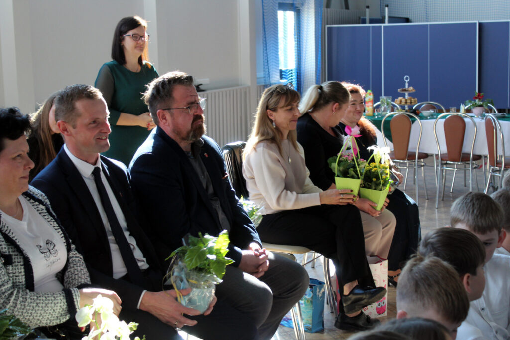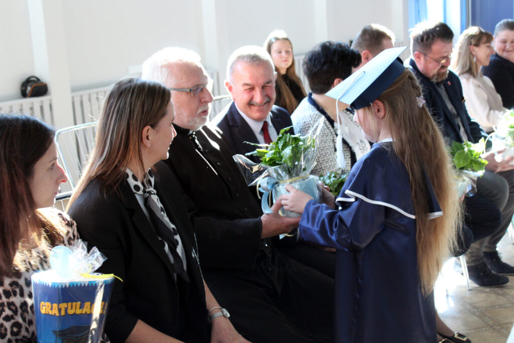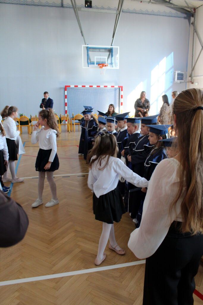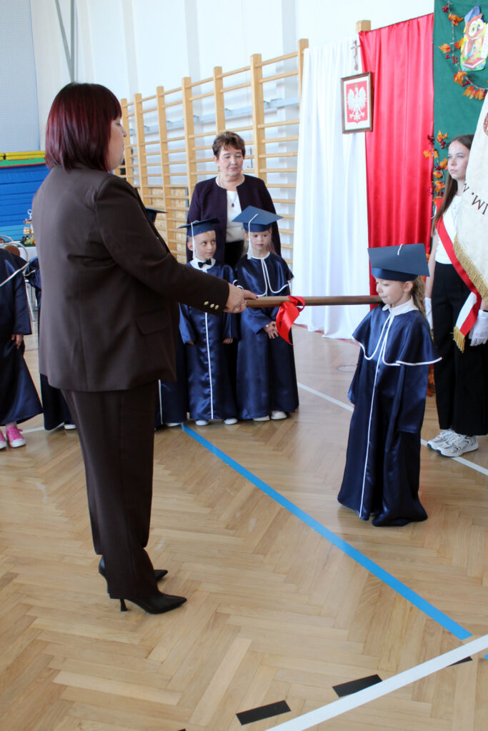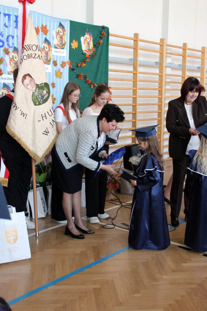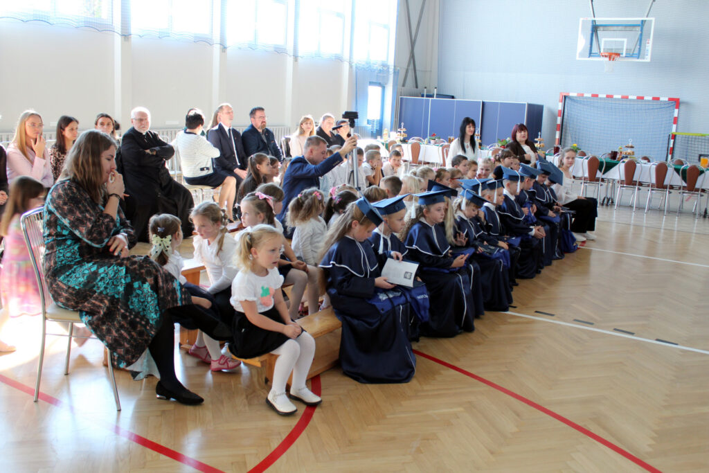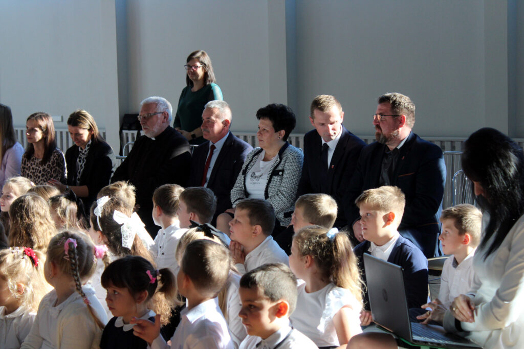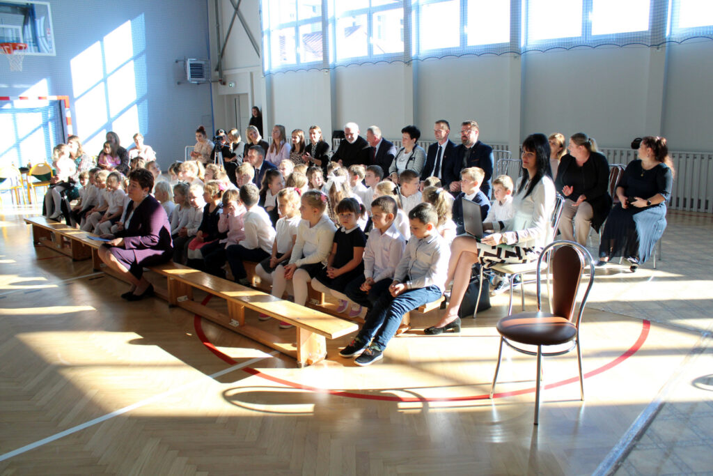 Uczniowie otrzymali pamiątkowe dyplomy z rąk Pani Sekretarz oraz upominki od Burmistrza Bobowej. Pani dyrektor złożyła gratulacje i życzenia dla uczniów. Następnie klasa druga pod kierunkiem pani Agnieszki Pater powitała pierwszoklasistów wierszem i piosenką oraz wręczyli upominki. Prezentów było więcej, gdyż przybyli goście też obdarowali pierwszaków słodkościami. Rogi obfitości dzieci zostały od swoich rodziców. Życzenia pierwszakom złożyli też przewodnicząca szkoły Joanna Chorąży
