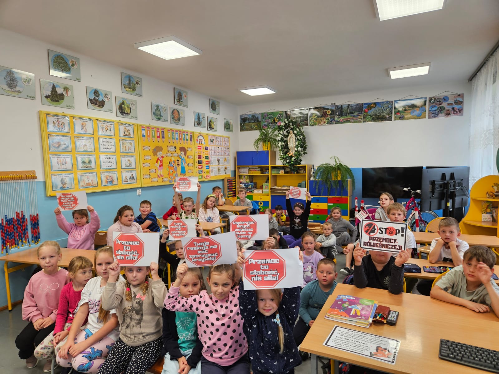o miejscach, w których można jej szukać. Godziny wychowawcze w klasach zostały poświęcone tematyce przeciwdziałania przemocy rówieśniczej. Rodzice, uczniowie i nauczyciele, za pośrednictwem strony internetowej szkoły, uzyskali dostęp do materiałów edukacyjnych. Naszą placówkę odwiedził również policjant, który przedstawił uczniom problem cyberprzemocy i hejtu. Podczas spotkania dzieci dowiedziały się, jakie zagrożenia mogą czyhać w sieci, jak rozpoznać niewłaściwe zachowania oraz gdzie szukać pomocy w sytuacji niebezpiecznej.