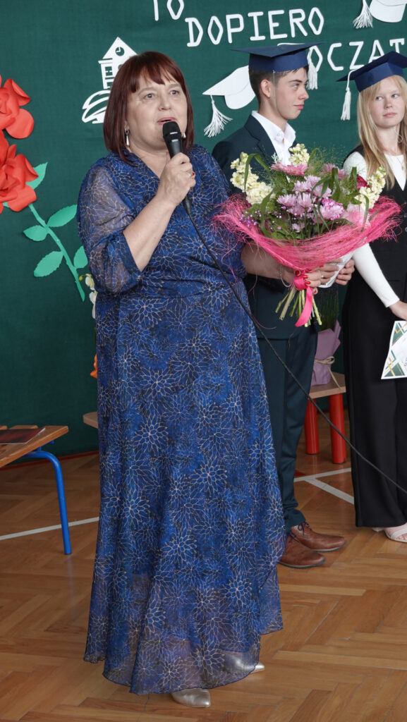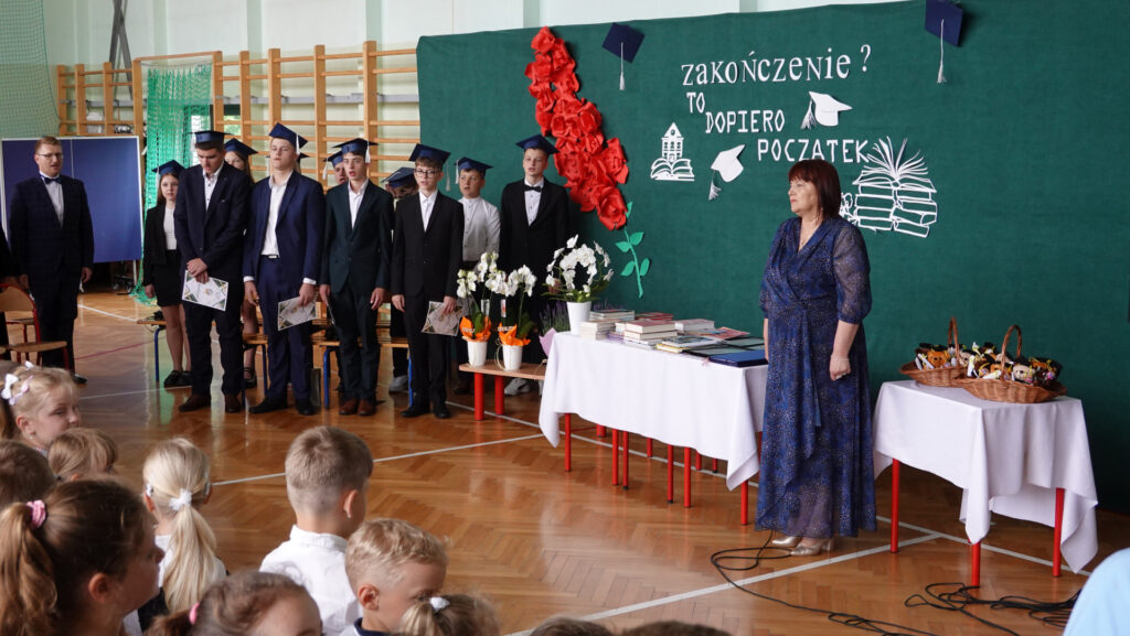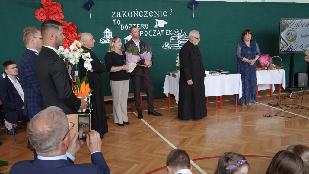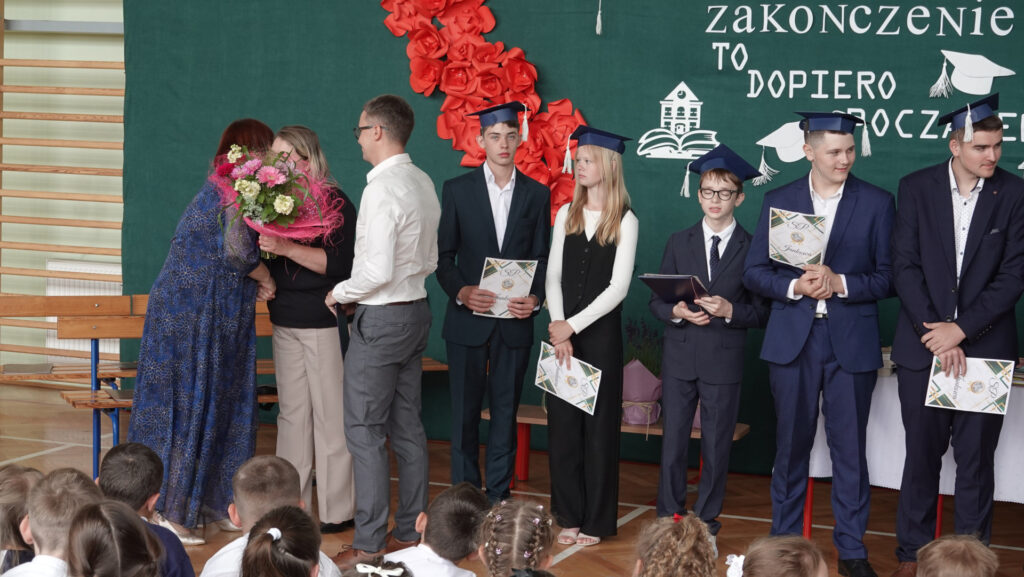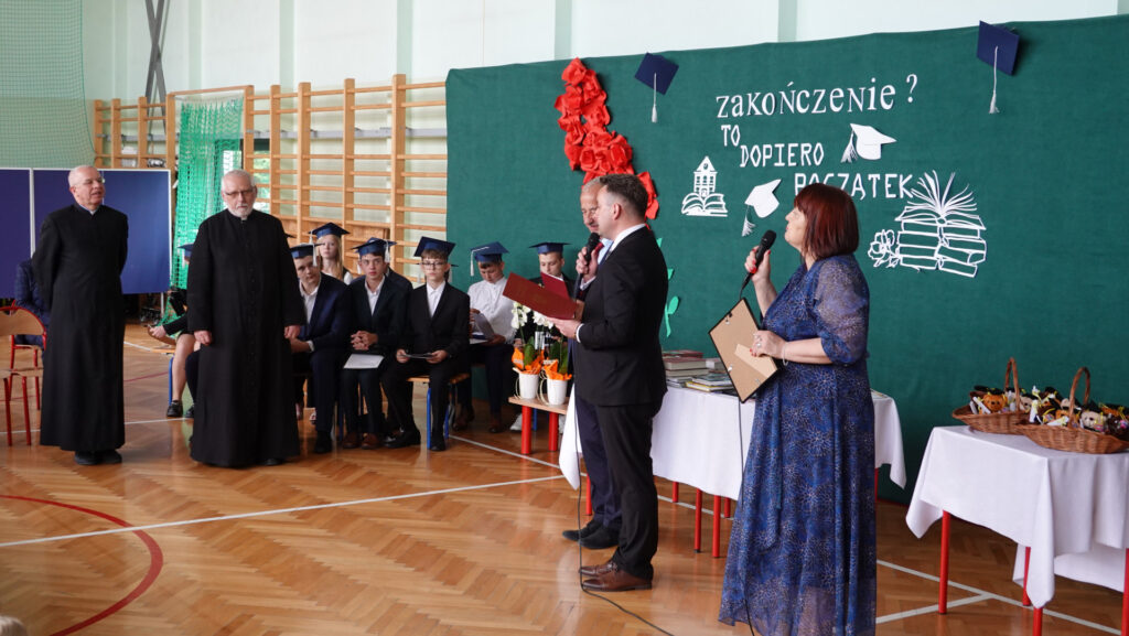W dalszej części wydarzenia Pani Dyrektor, wspólnie z Panem Bogdanem Krokiem oraz Wychowawcą klasy ósmej, wręczyła listy gratulacyjne dla rodziców oraz uczniów, wyrażając uznanie dla ich pracy, zaangażowania i wspólnego wysiłku włożonego w edukację.