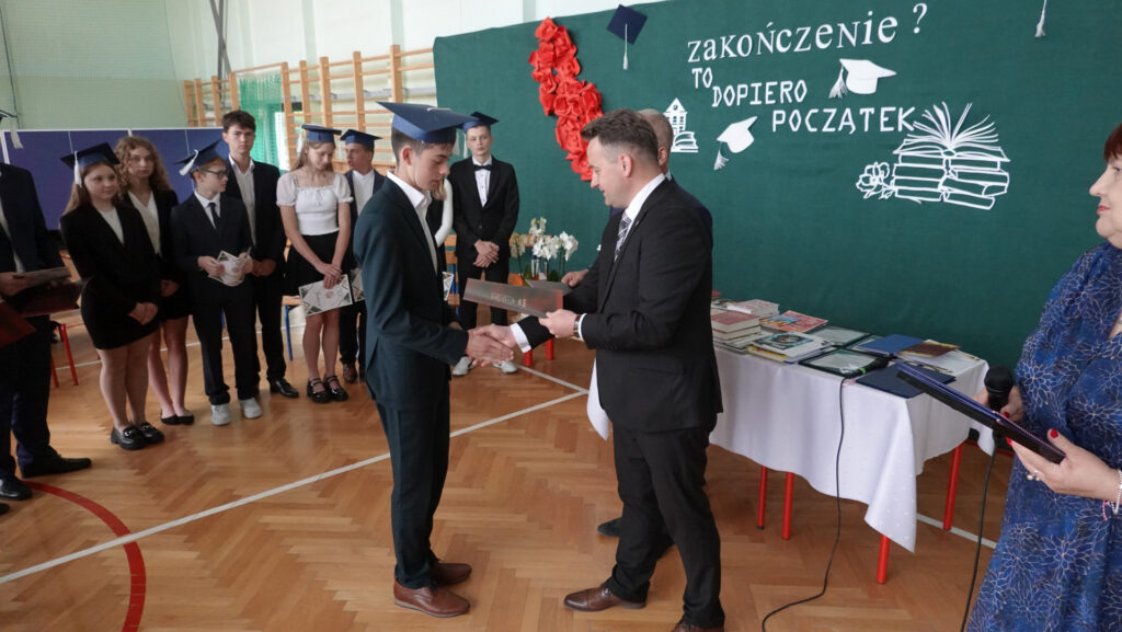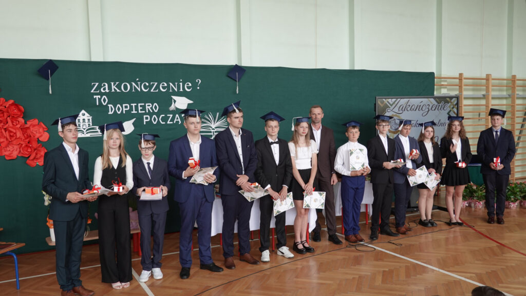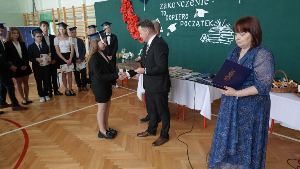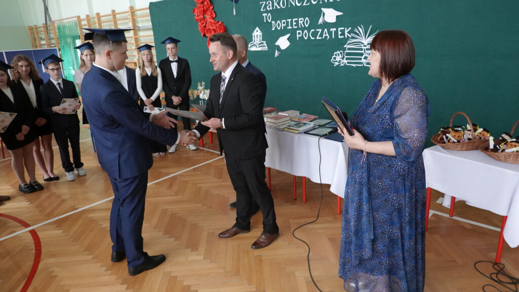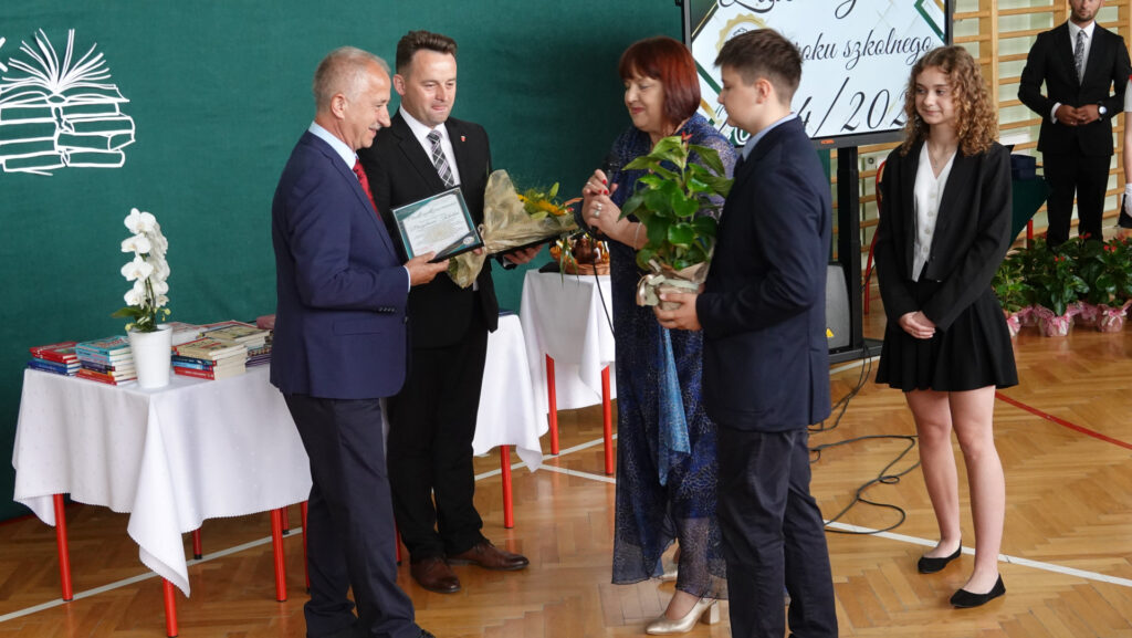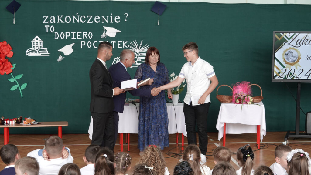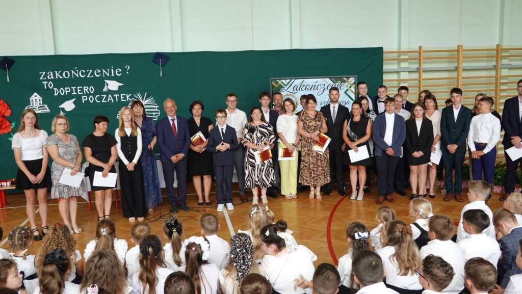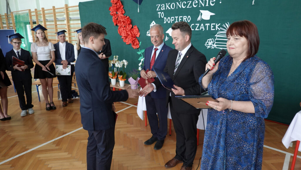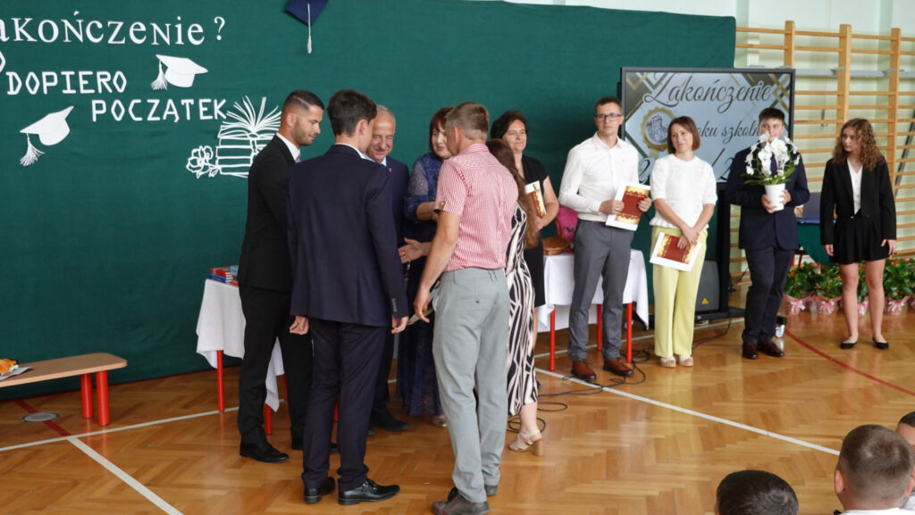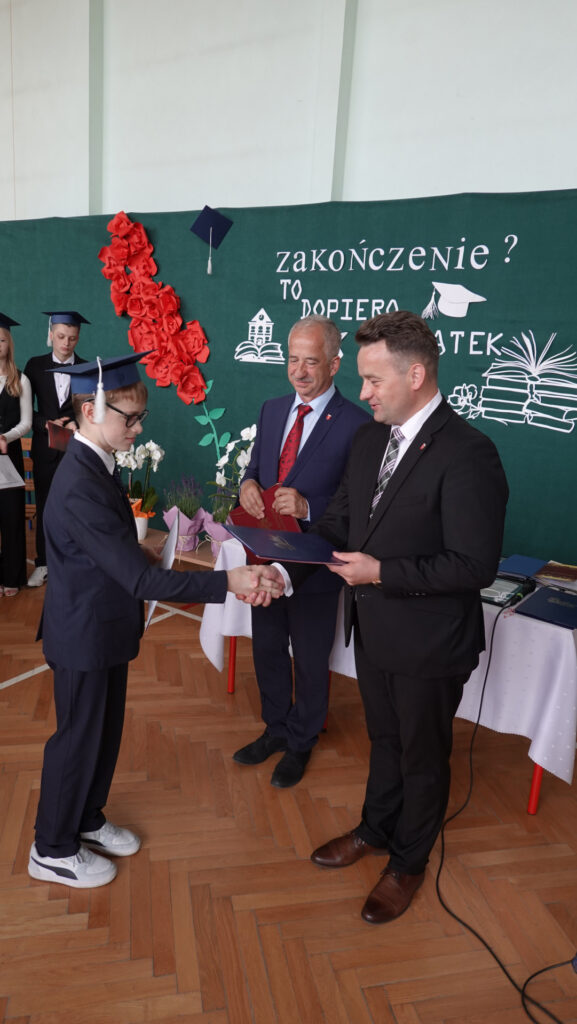 Podczas uroczystości Pan Burmistrz Marcin Wąs wręczył uczniom klasy ósmej listy gratulacyjne, doceniając ich osiągnięcia i zaangażowanie. Pan Mateusz Semla przekazał uczniom gadżety, a Pan Ćwikła uhonorował najlepszych uczniów, przyznając im stypendia za wybitne wyniki w nauce.