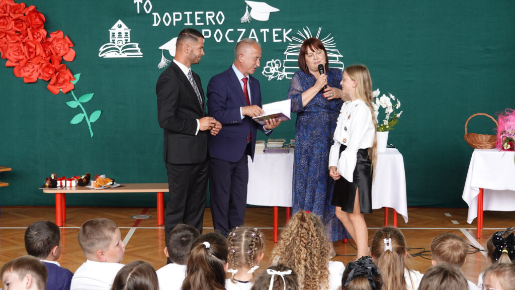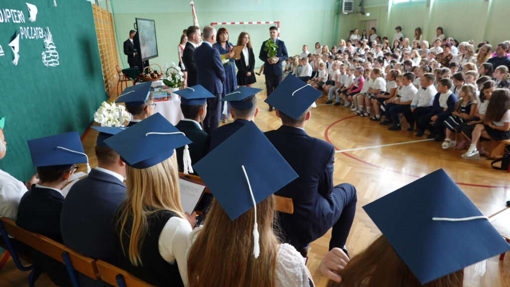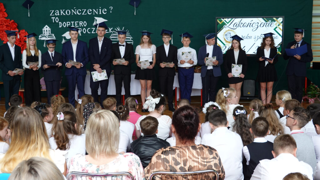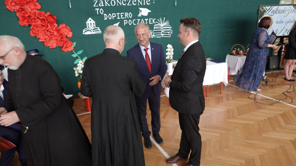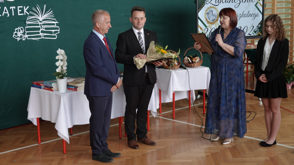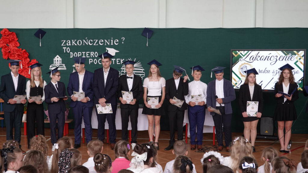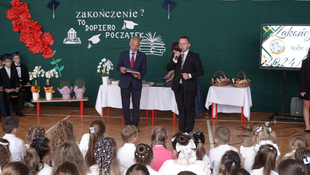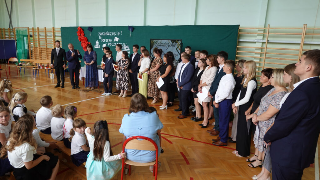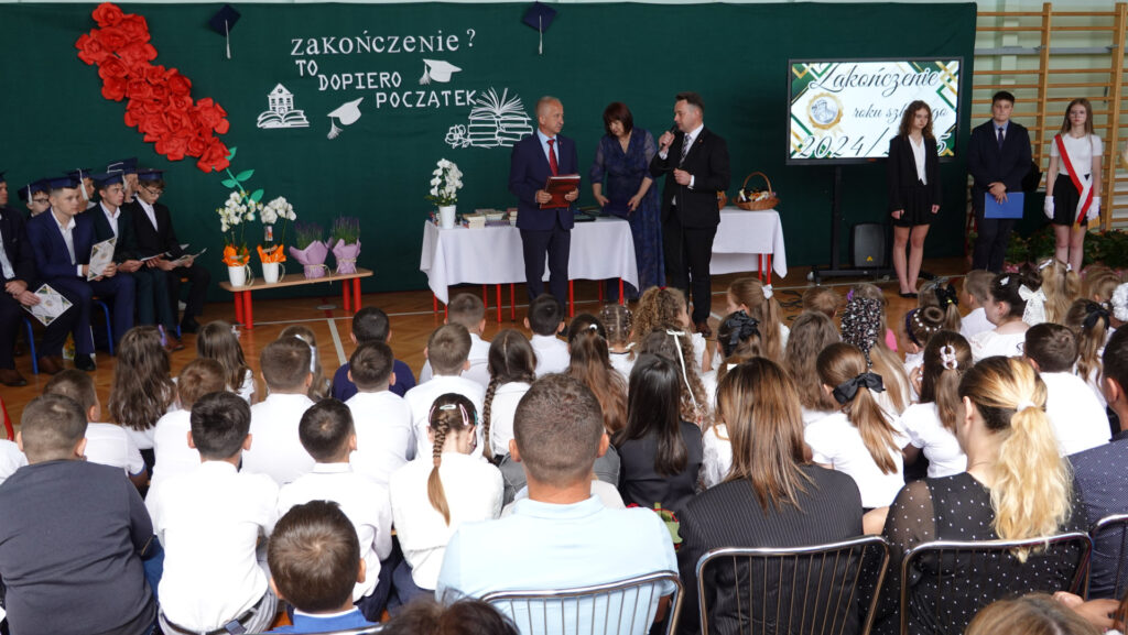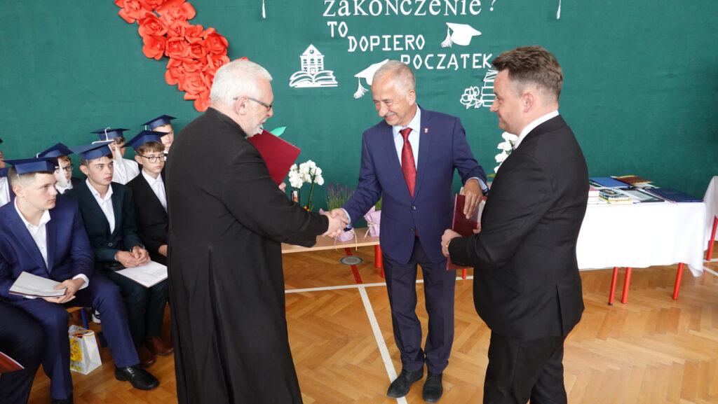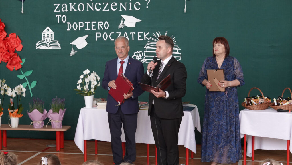 Podczas uroczystości Pan Burmistrz Marcin Wąs wręczył uczniom klasy ósmej listy gratulacyjne, doceniając ich osiągnięcia i zaangażowanie. Pan Mateusz Semla przekazał uczniom gadżety, a Pan Ćwikła uhonorował najlepszych uczniów, przyznając im stypendia za wybitne wyniki w nauce.